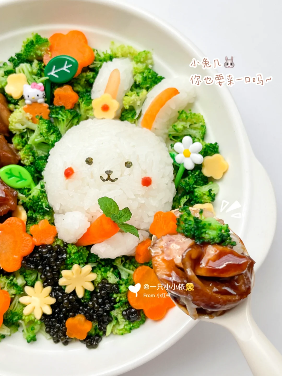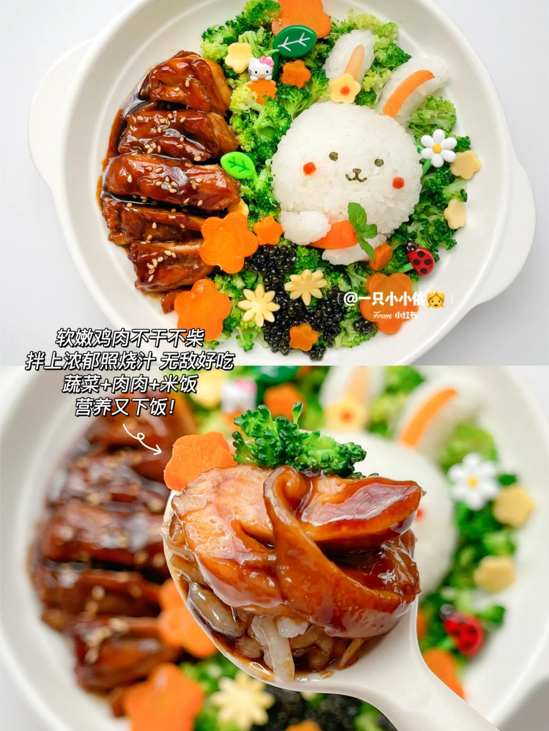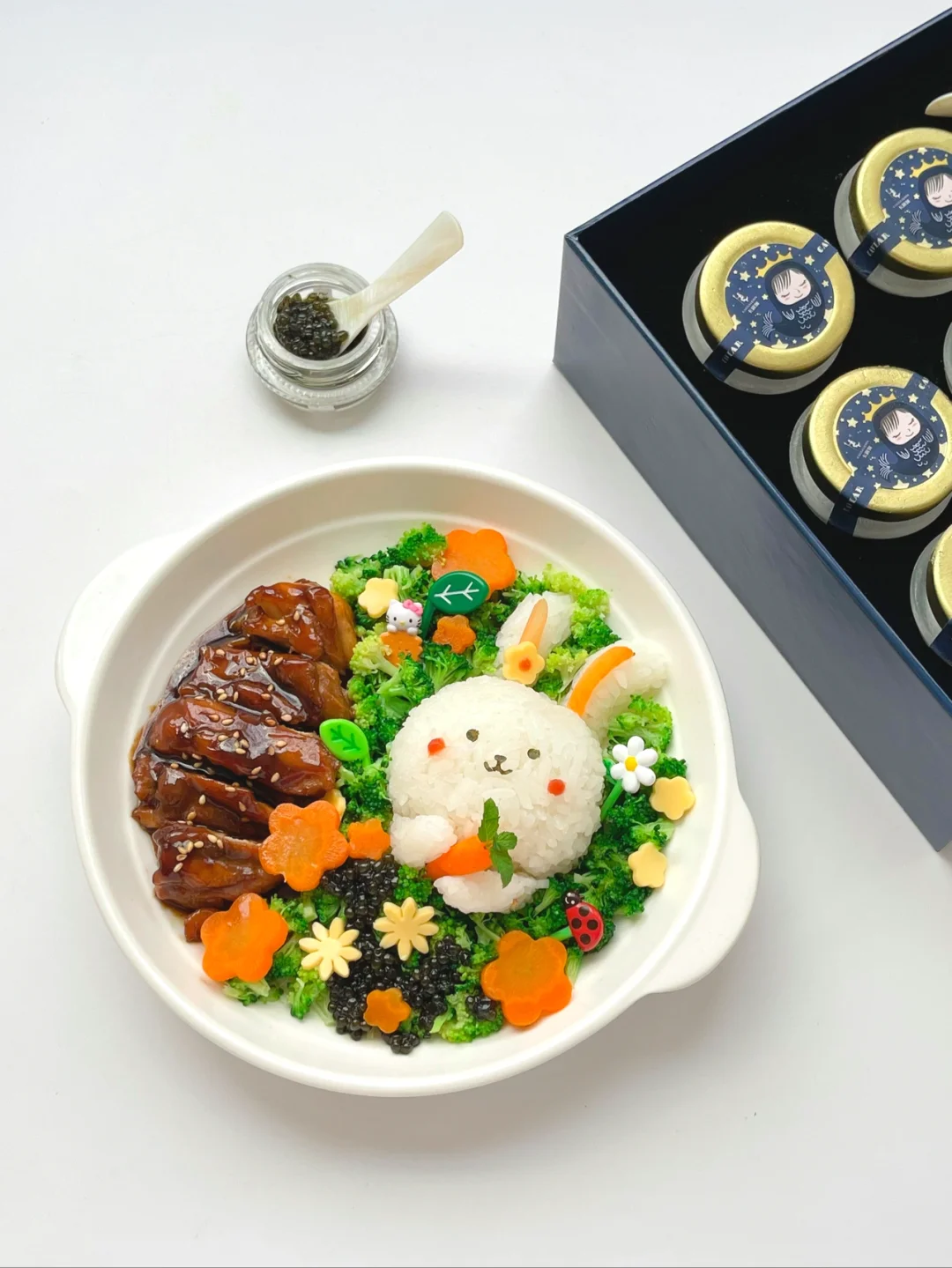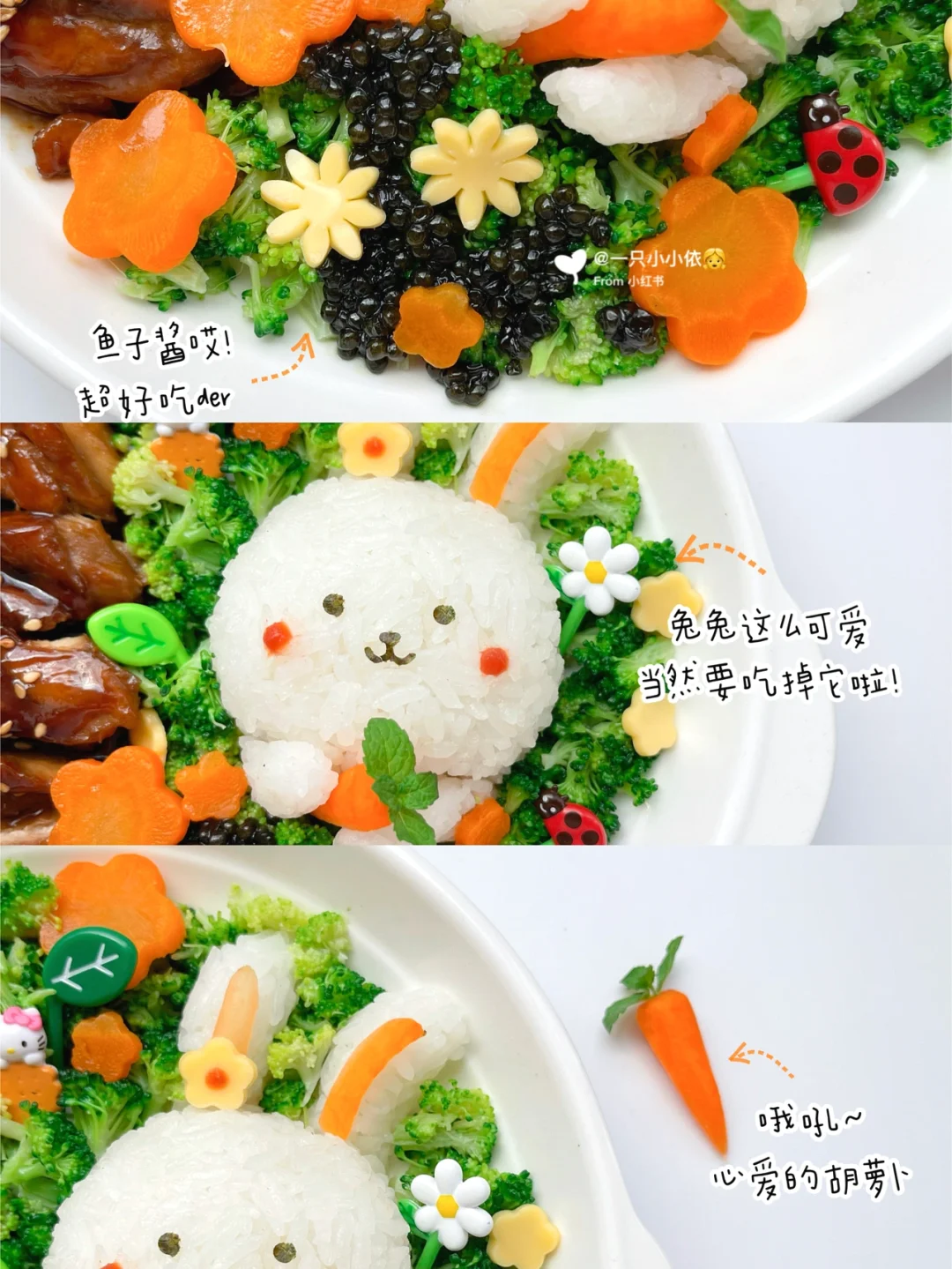 🍗美味下饭的照烧鸡腿饭旁,藏着一只可爱兔兔饭团,手中还抱着一根迷你胡萝卜🥕我依瞬间被吸引~