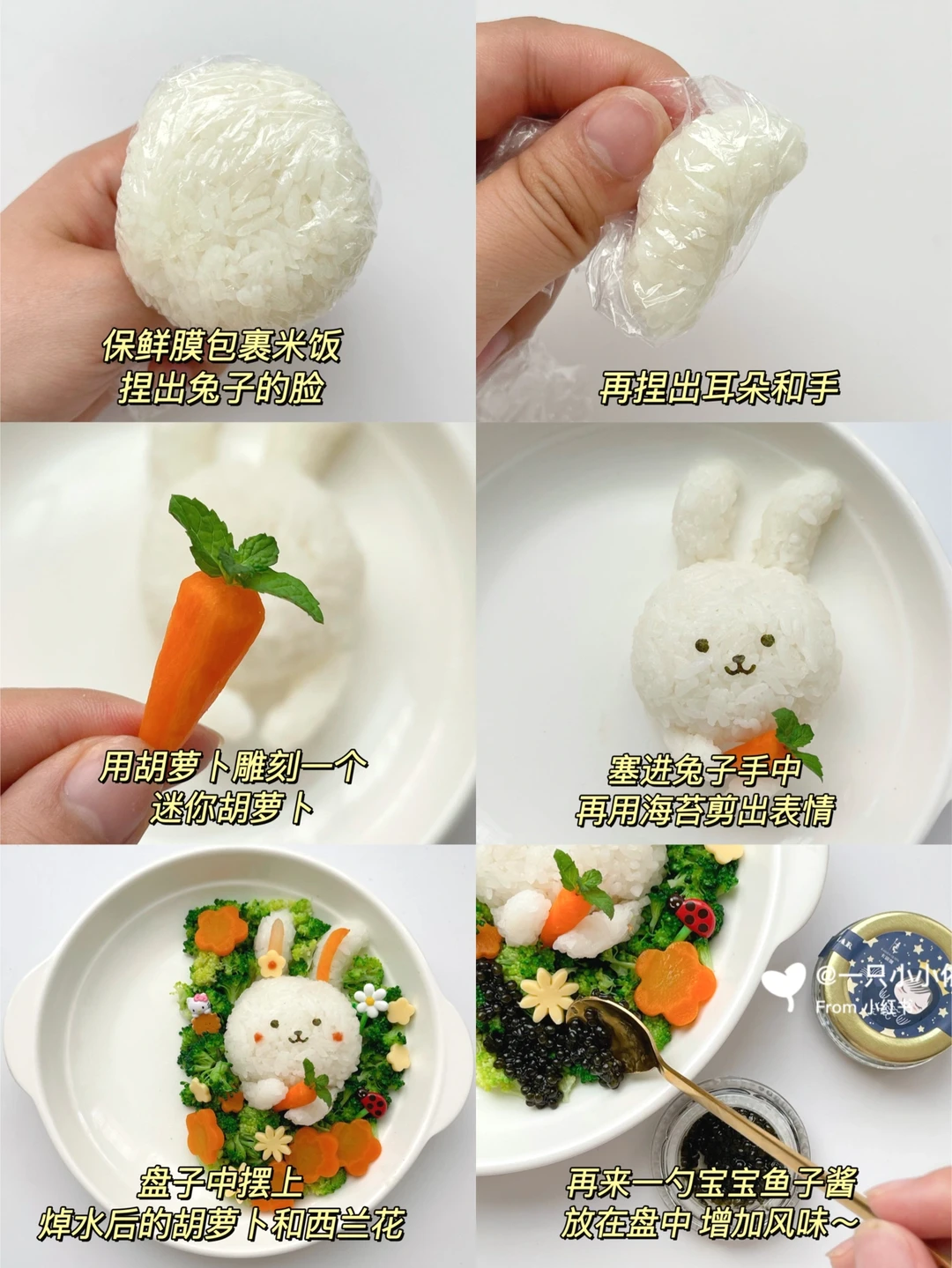 1⃣️保鲜膜包裹米饭,捏出兔子的脸、耳朵和手等部位;