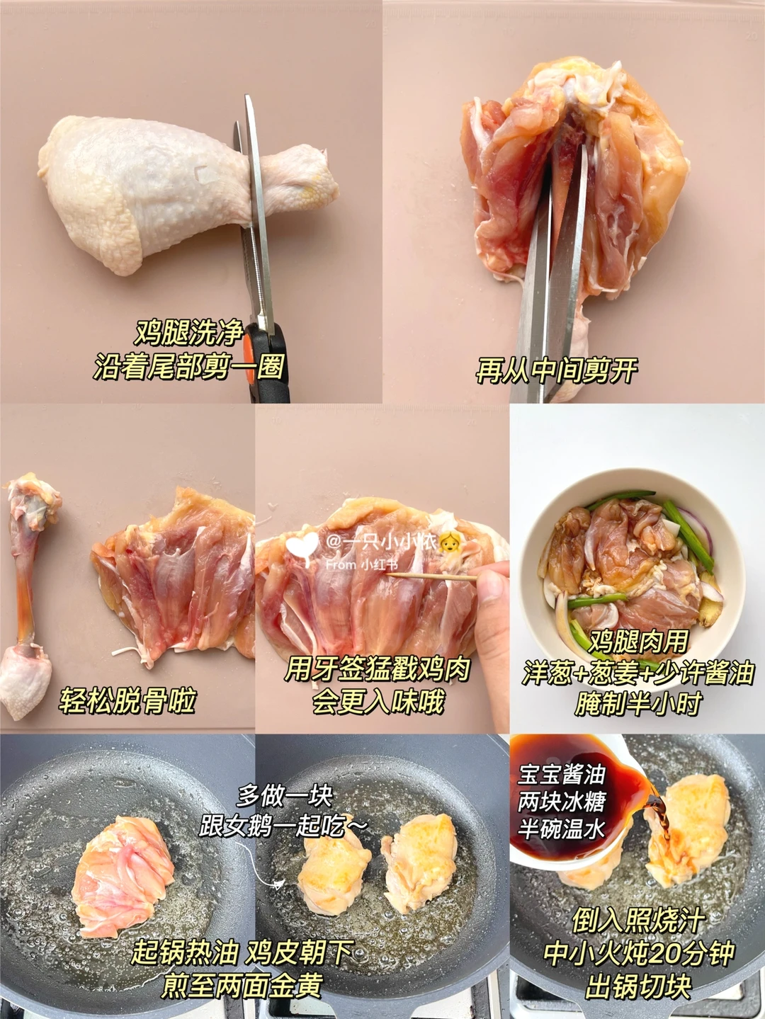 1⃣️鸡腿洗净,沿着尾部剪一圈,再从中间剪开,就能轻松脱骨,再用牙签猛戳鸡肉会更入味;
