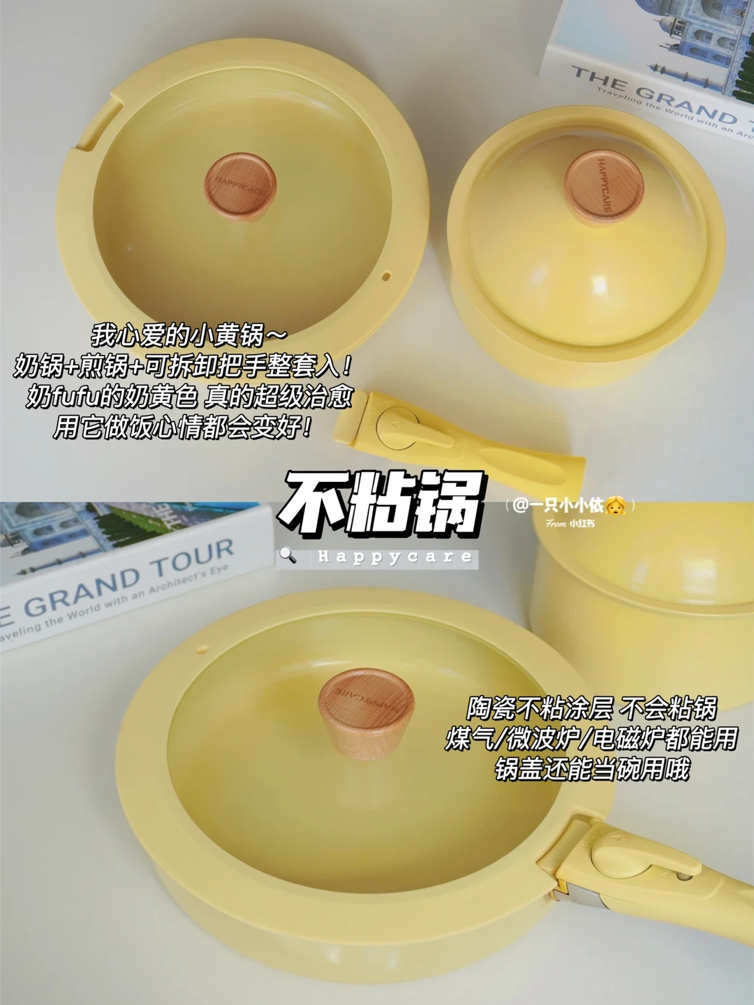 👉我心爱的小黄锅,奶fufu的颜色超级治愈!我是奶锅+煎锅一套入的,把手是可以拆卸的,拆掉后锅就变成了碗。它的涂层是陶瓷的,不会粘锅~虽然不挑灶具,但是明火用的话还是建议小火哦