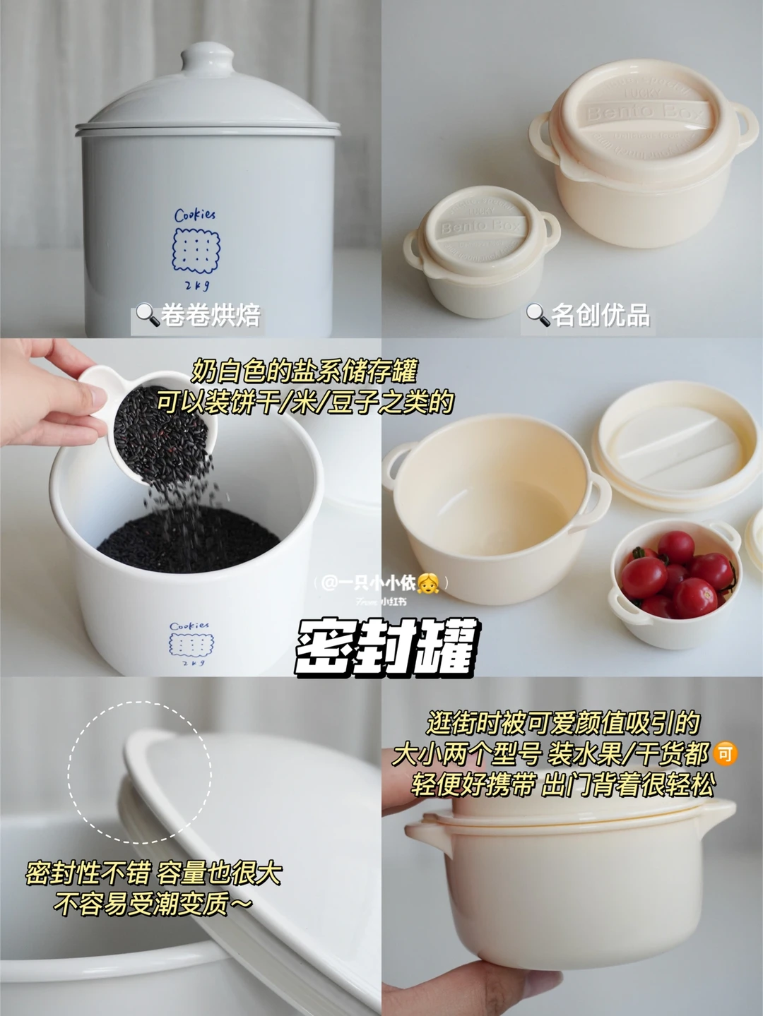 👉奶白色的盐系储存罐,容量很大,密封性不错,装饼干/米/豆子都可,不容易受潮变质~卡其色的密封碗,小巧轻便不占地,小的可以装水果,方便携带!