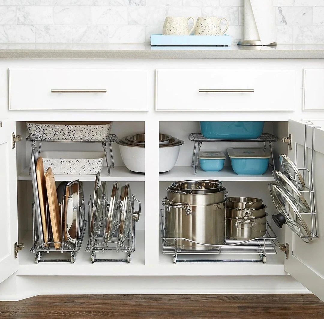 图2⃣️ 橱柜里用收纳架整理锅具、砧板,锅盖挂在柜门