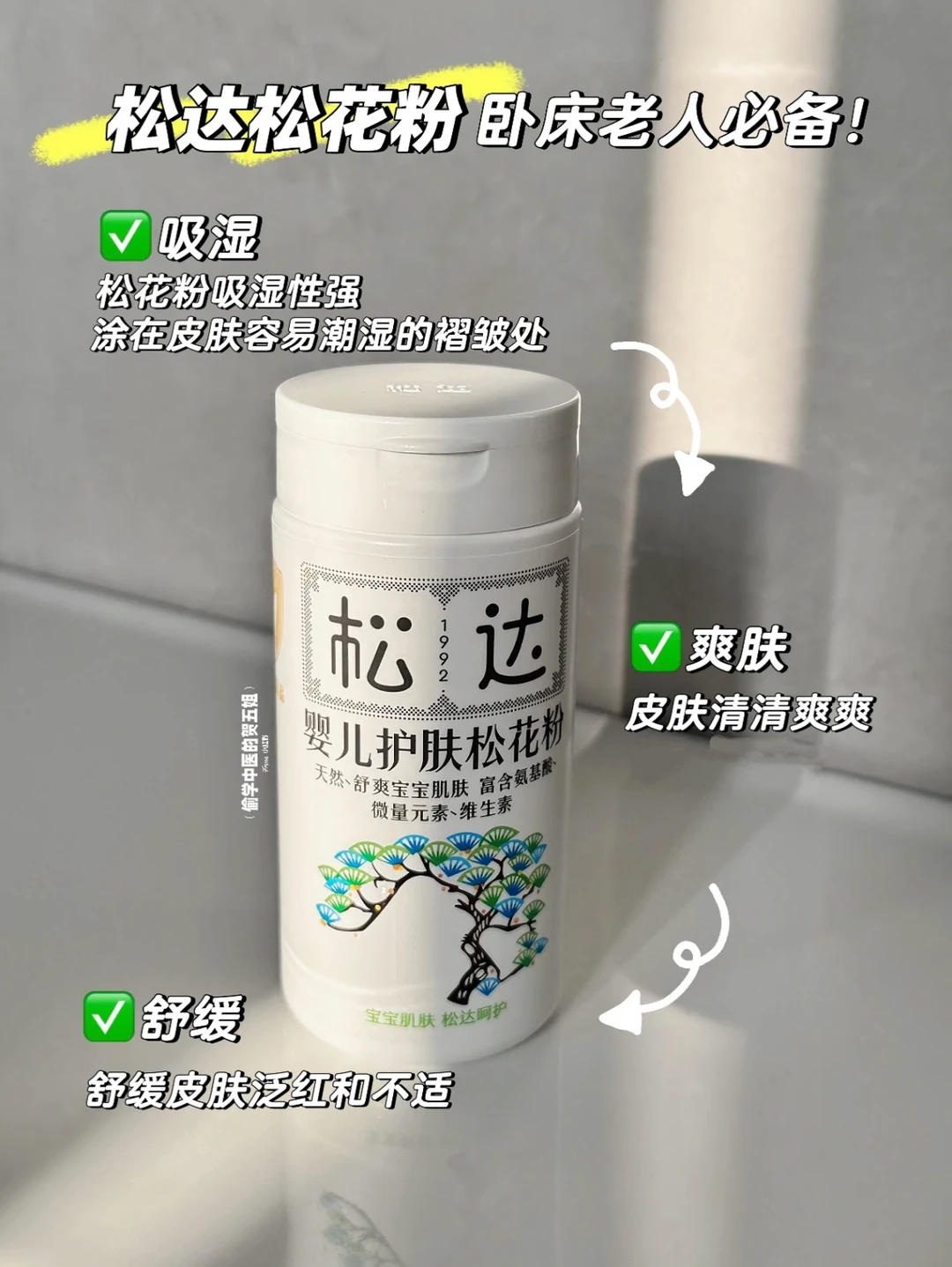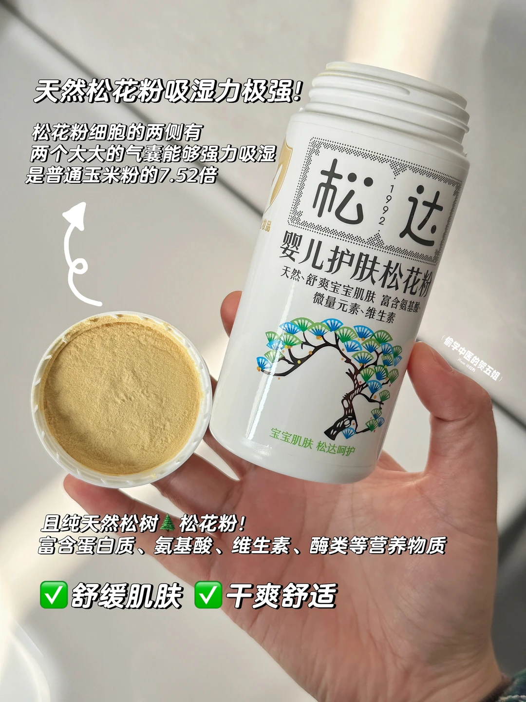 ✅每次清洁肌肤后可涂抹「松达松花粉」这是一个30多年的国货老品牌了🔥它的成分只有100%天然的松树花粉,0防腐剂,0香精,0滑石粉添加,婴儿级护肤纯植物萃取用了很放心~