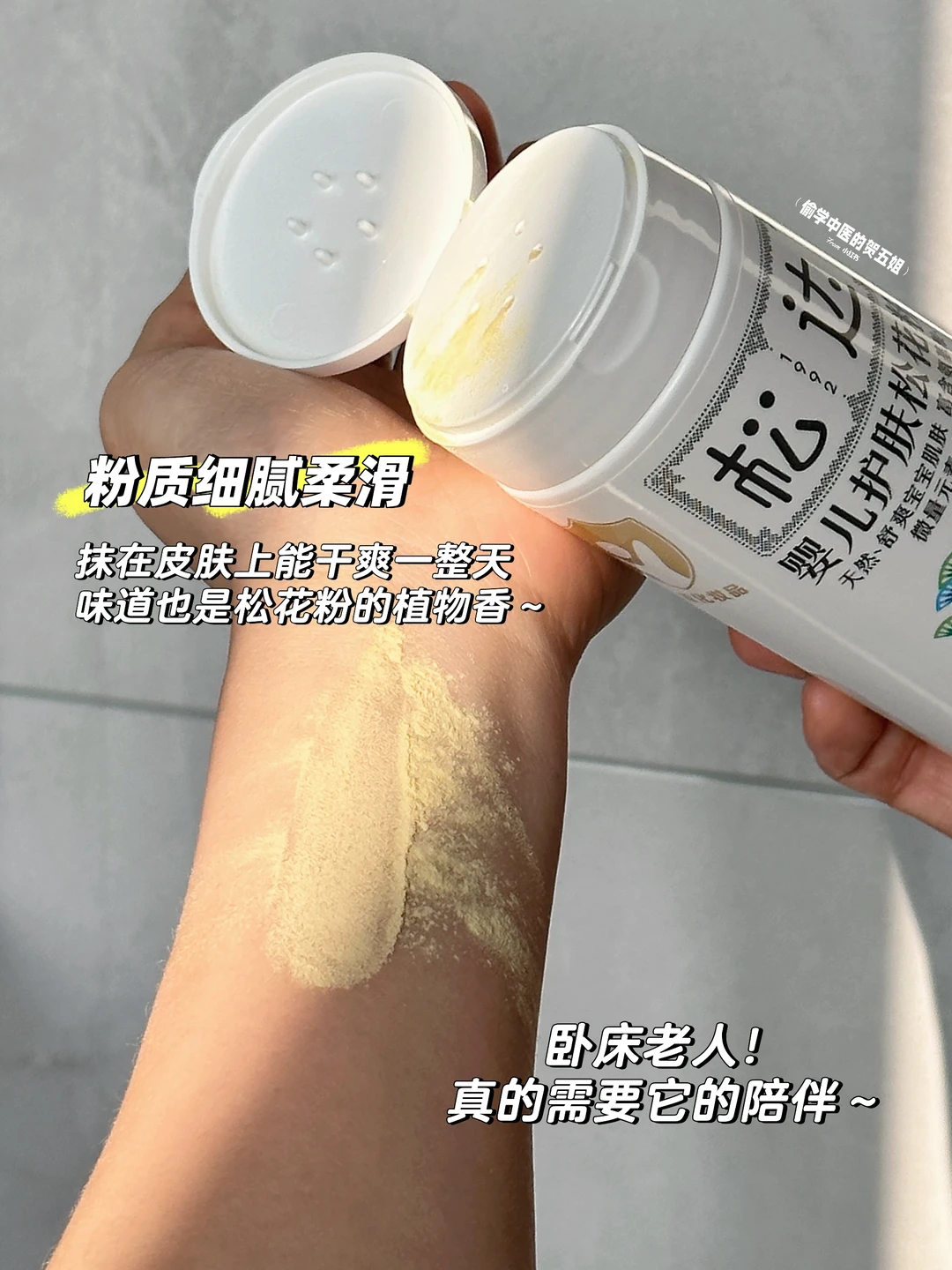 👉它的粉质感很细腻~涂抹在受压潮湿部位,很快就能变得干爽,而且松花粉本身自带花粉的清香~闻着也叫人心情舒畅~