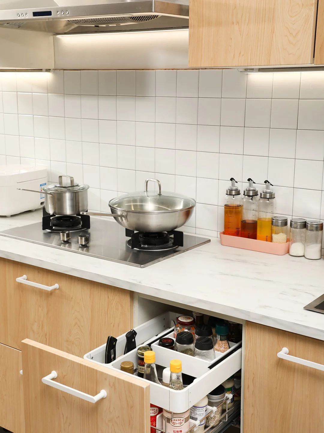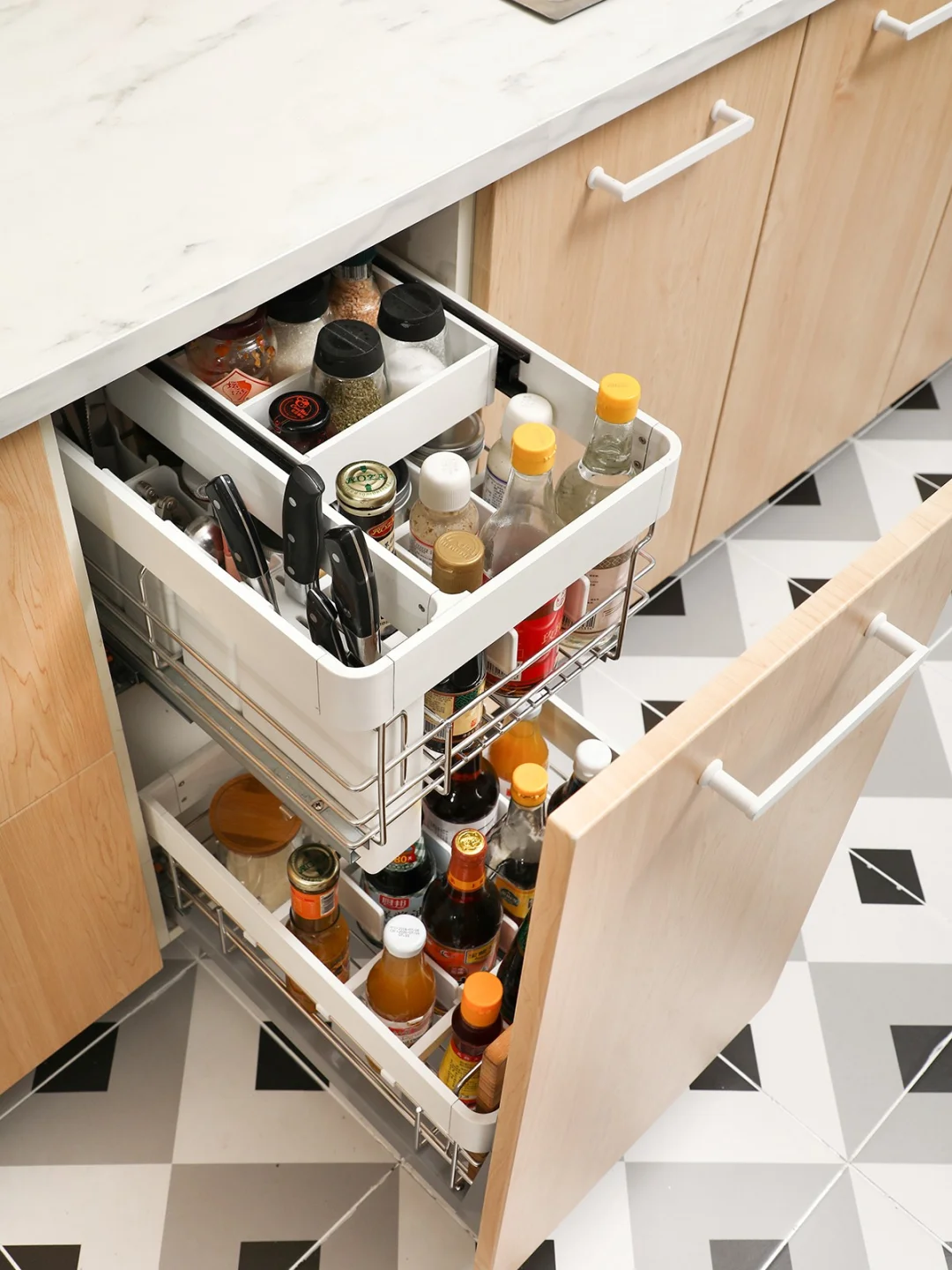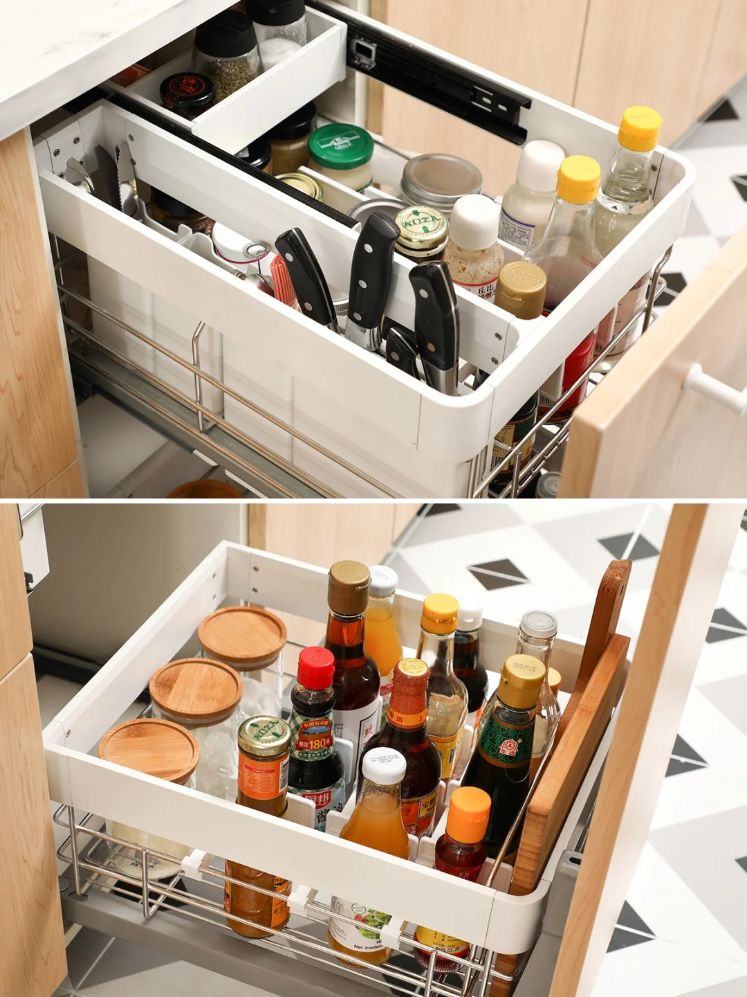 上层收纳常用调料,可以调节的挡条和分隔片,让瓶子摆放更稳妥;同时利用原本浪费的单层拉篮高度空间,多加了一层小内抽来收纳常用的矮瓶调料,多了一层收纳空间,可以收纳更多东西,提高空间利用率。