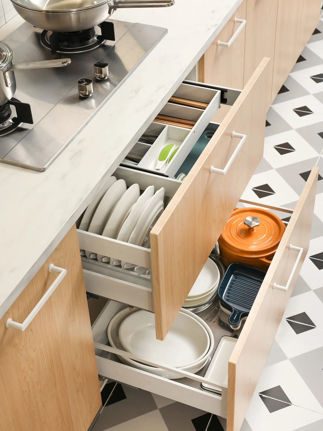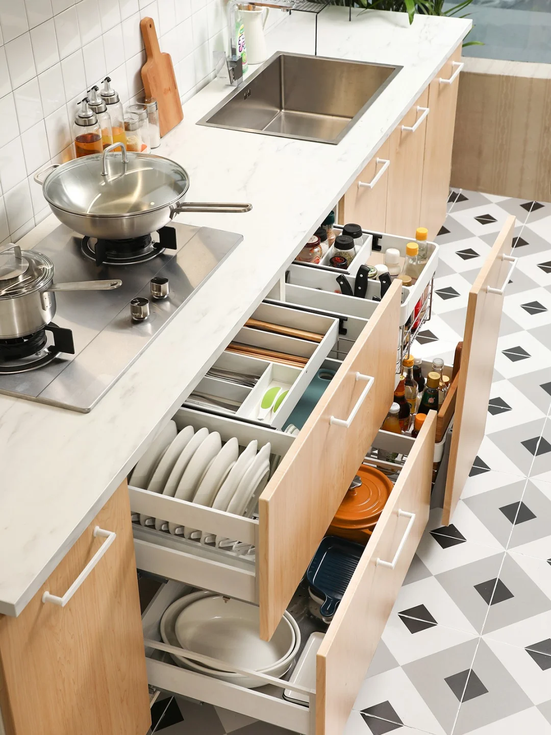 ⭐碗碟拉篮:安装在灶台下区域,动线安排合理