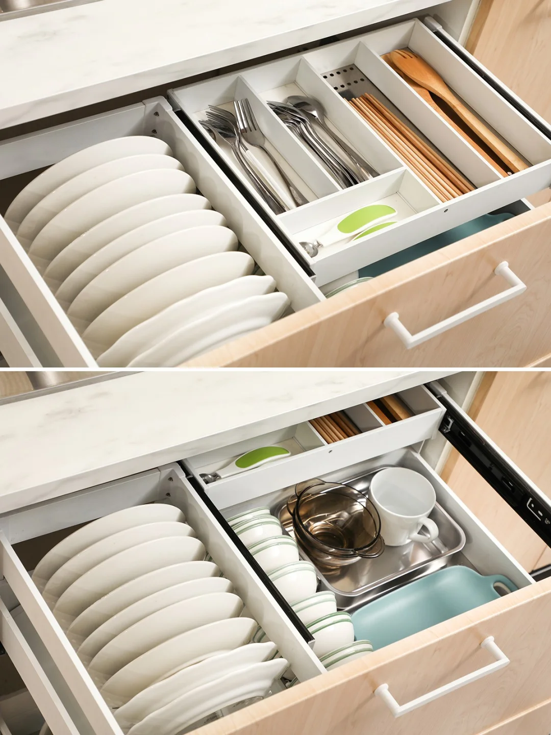 ➡️第一层:这一层分区的设计很好的满足了收纳不同类型物品的功能,碗盘竖放收纳,整齐的同时更方便拿取,设计多了一个内抽也是很好地利用了拉篮单层的闲置空间,相当于上层有2层空间,空间利用率大大提升,餐具集中分类收纳,使用起来更方便;碗碟、餐具摆放一目了然,下厨也更省心。