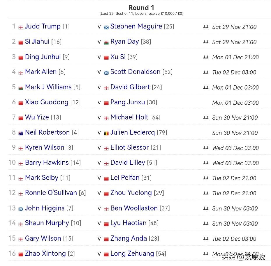 张安达、雷佩凡、徐思、庞俊旭、龙泽煌进英锦赛正赛,贺国强意外出局。加上之前晋级的周跃龙、吕昊天,一共有7名中国球员通过资格赛晋级正赛,加上前十六5人,今年的英锦赛正赛,一共有12名中国球员参加,第一轮有三场德比,就是说中国球员已经锁定3个16强席位。 昨夜今晨英锦赛资格赛第四轮继续进行,结果龙泽煌6-5绝杀实力派选手希斯科特,庞俊旭6-2胜桑坎姆,今天凌晨的比赛,张安达6-4击败快枪手塔猜亚,张安达一度5-1拿到赛点,被塔猜亚连追3局。雷佩凡6-5逆转绝杀吉米·罗伯逊,徐思6-3击败福德。贺国强4-6负勒克莱尔,贺国强从1-4追到4-4,最终4-6告负。 至此,英锦赛资格赛全部结束,7名中国球员通过资格赛晋级正赛,加上前16的丁俊晖、赵心童、肖国栋、吴宜泽、斯佳辉等5人,中国军团共有12人参加英锦赛正赛,这个成绩还是相当不错的。 北京时间昨晚11点,英锦赛正赛第一轮抽签,中国球员总的来说签位不错,有三场德比,这就是说有3名球员锁定16强席位。具体对阵见图。 英锦赛正赛11月29日开打,中国球员加油!