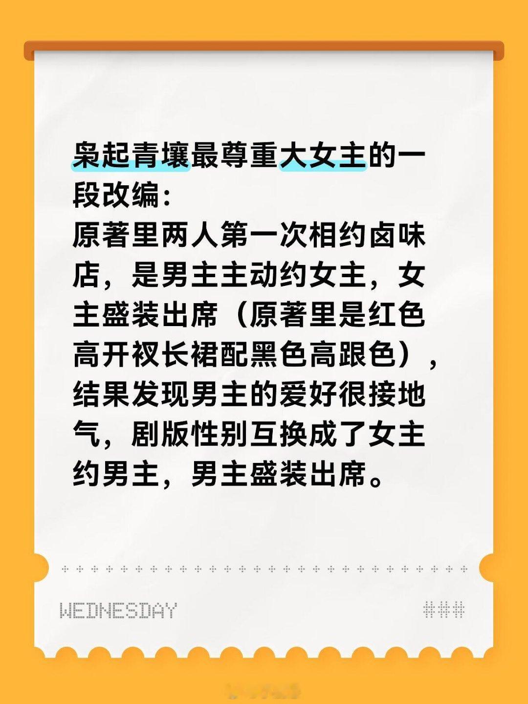 电视剧枭起青壤枭起青壤最尊重大女主的一段改编:原著里两人第一次相约卤味店,是男主主动约女主,女主盛装出席(原著里是红色高开衩长裙配黑色细高跟),结果发现男主的爱好很接地气,剧版性别互换成了女主约男主,男主盛装出席。其实在去年拍摄期路透流出的时候我就注意到了这里,有一些粉丝(不知道是书粉还是巴粉)看到了卤味店的路透之后,在讨论这段服装不还原的问题,我理解她们的想法是想看热巴更多的美丽造型,想尽可能还原原著,但我作为一个尾鱼书粉其实对100%还原原著没那么大的执念,但我真的没想到能遇见这么用心的影视化团队,看到这段改编的时候我都感动了电视剧枭起青壤‖迪丽热巴‖聂九罗‖陈星旭‖炎拓‖