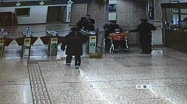 “快,把轮椅推来!”驻站警力与车站工作人员将李阿姨扶到轮椅上,他们接过老人行李,背起老人背包,推着老人快速前行。