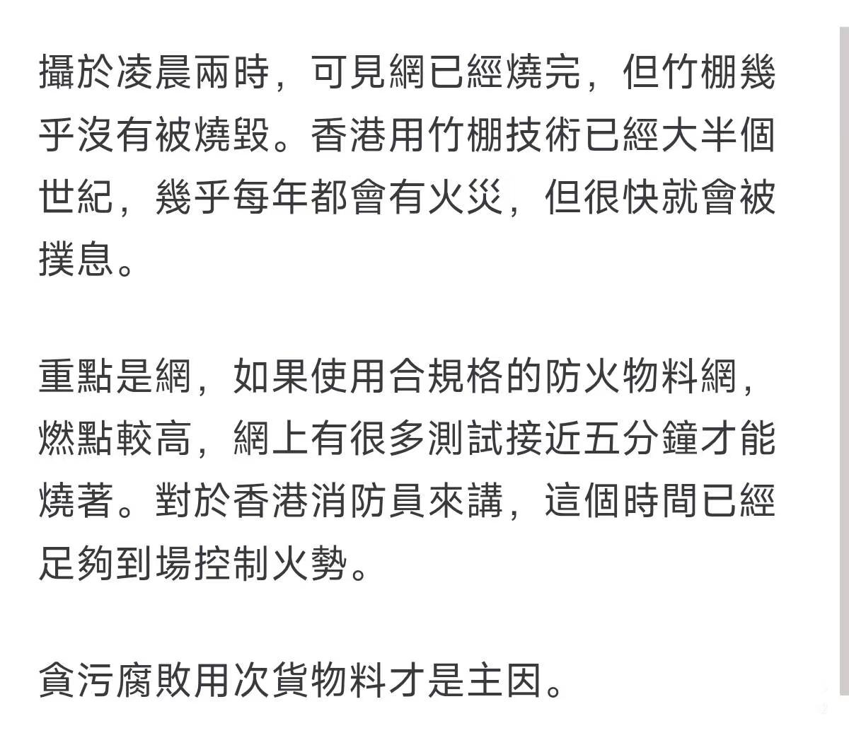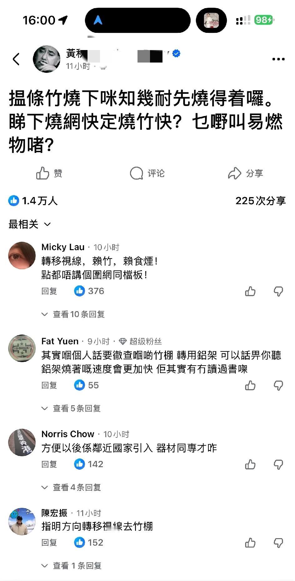 香港黄先生发文:烧网快还是烧竹子快?竹子真的易燃助燃? 面对网友铺天盖地的对香港竹棚的质疑,发现不少香港人有自己独到的见解。 问题是不管是竹子还是网,都是容易燃烧的,不能因为网更容易燃烧,就觉得竹子没问题吧?