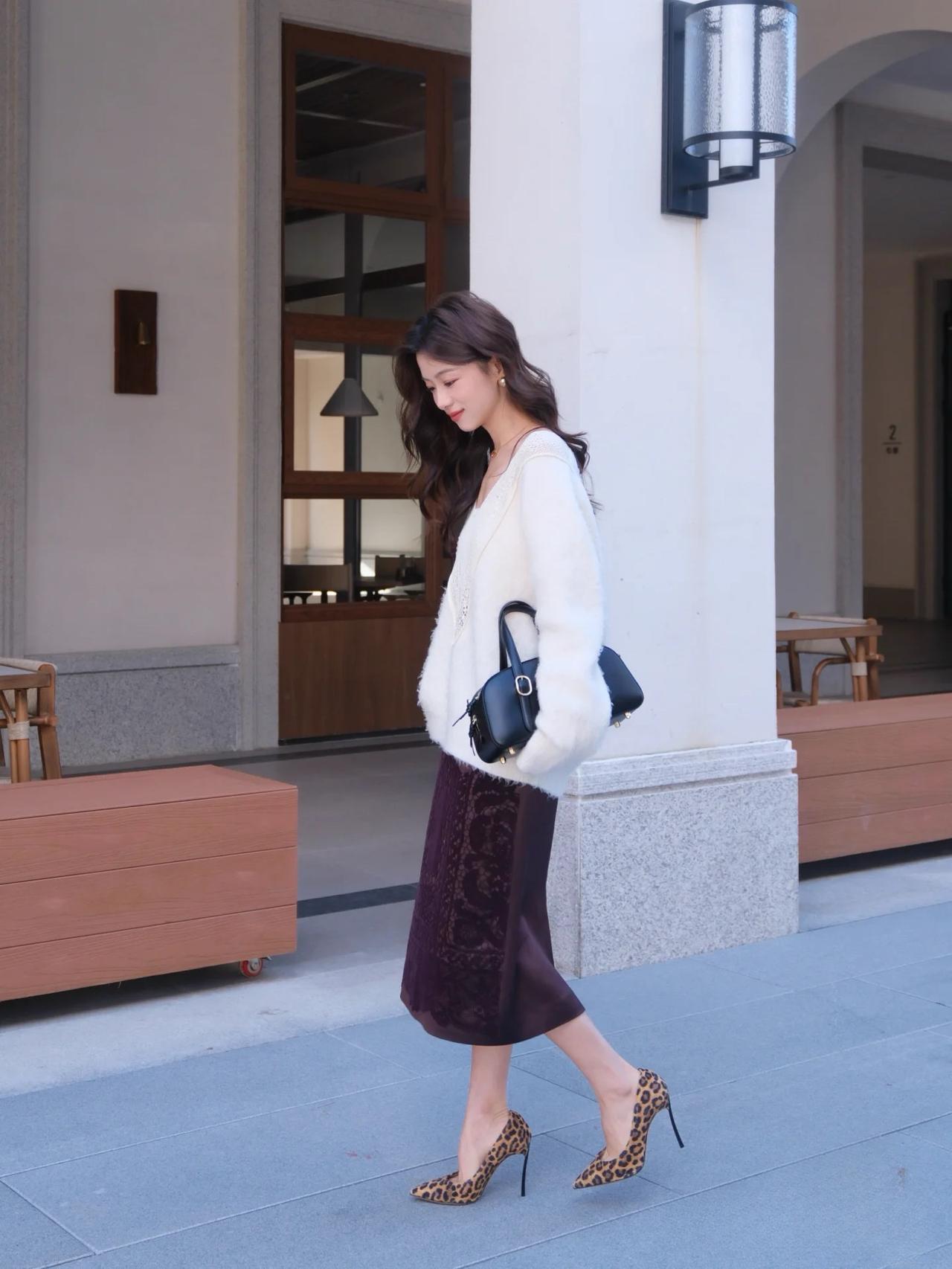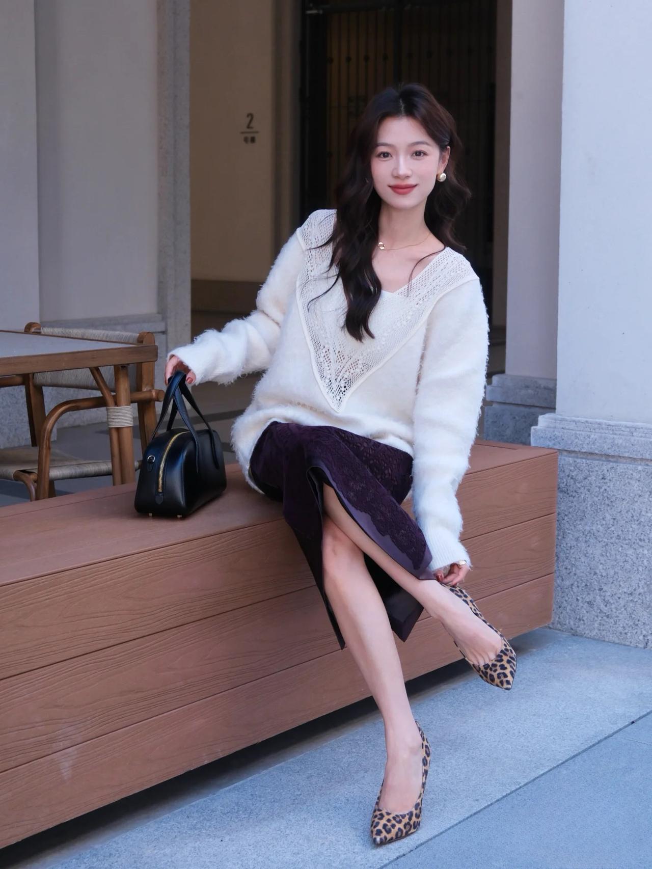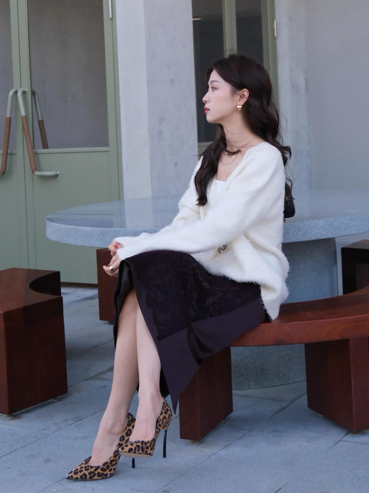 优雅气质,白色毛衣搭配黑色蕾丝裙,高跟鞋点缀,完美时尚。