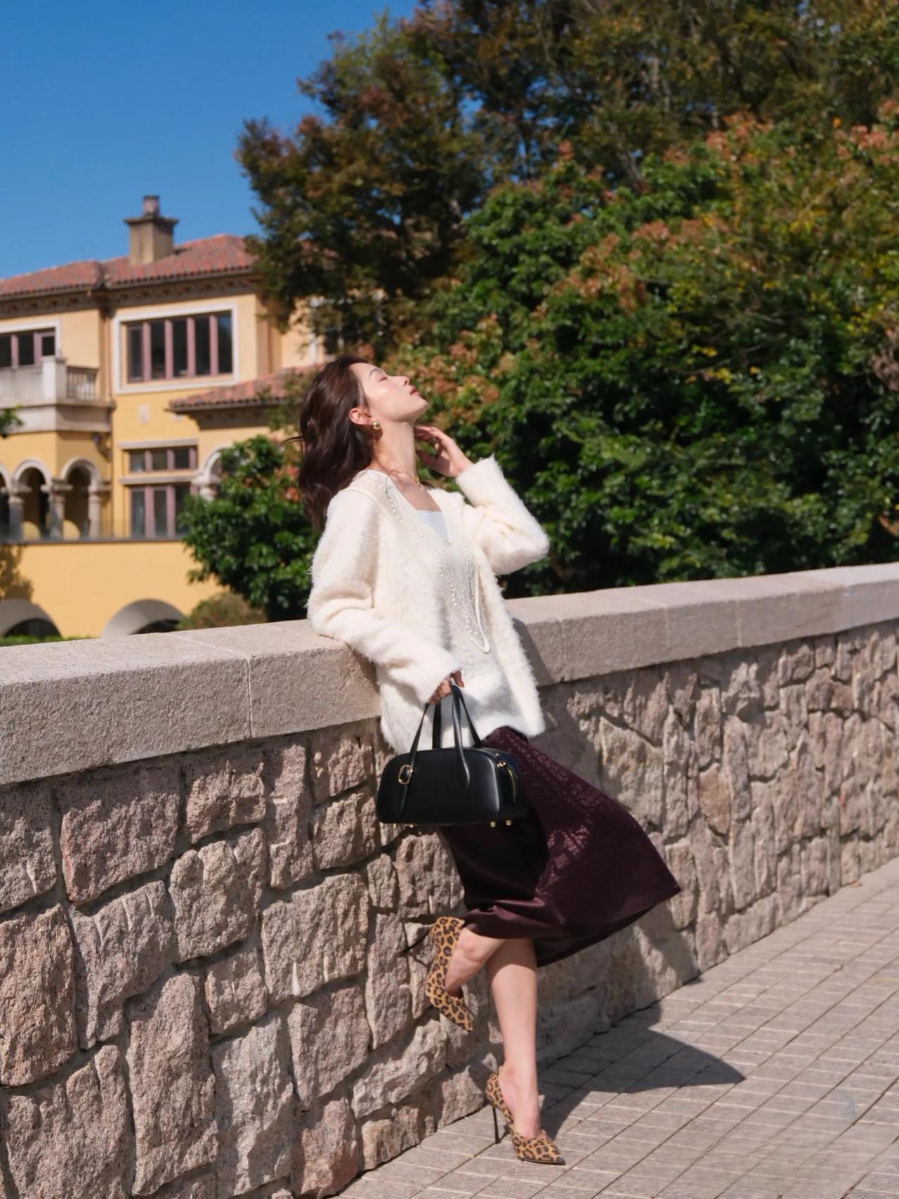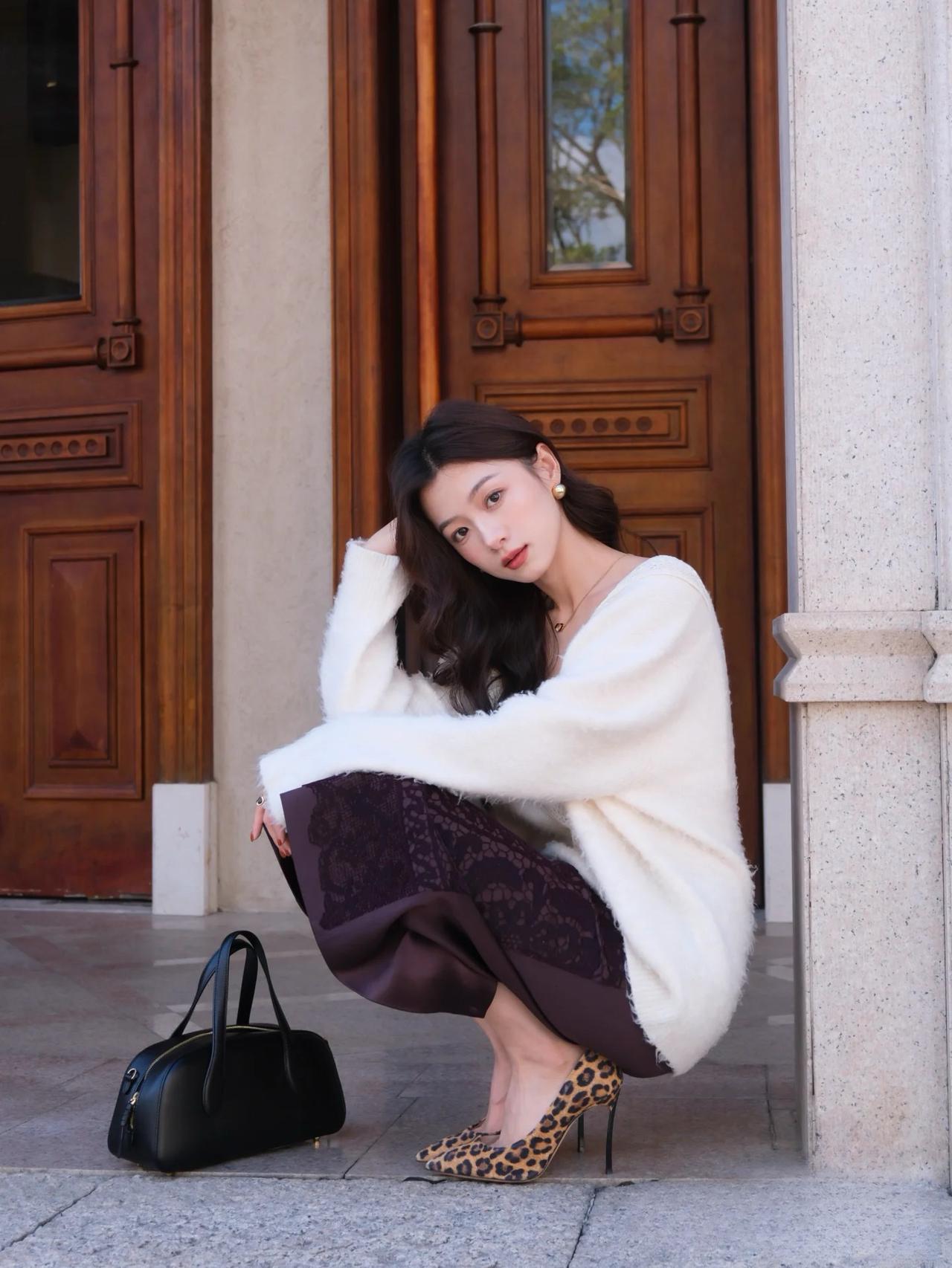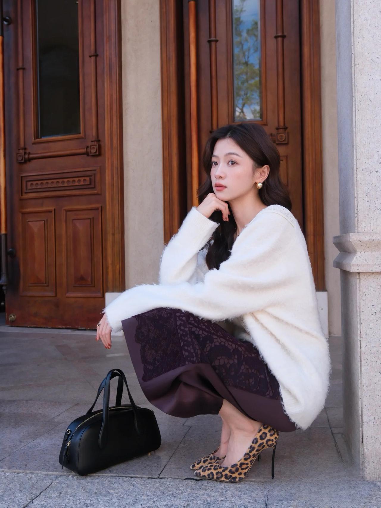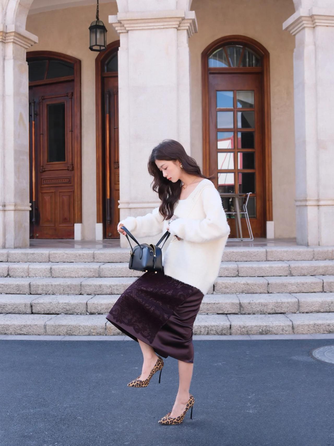 优雅气质,白色毛衣搭配黑色蕾丝裙,高跟鞋点缀,完美时尚。