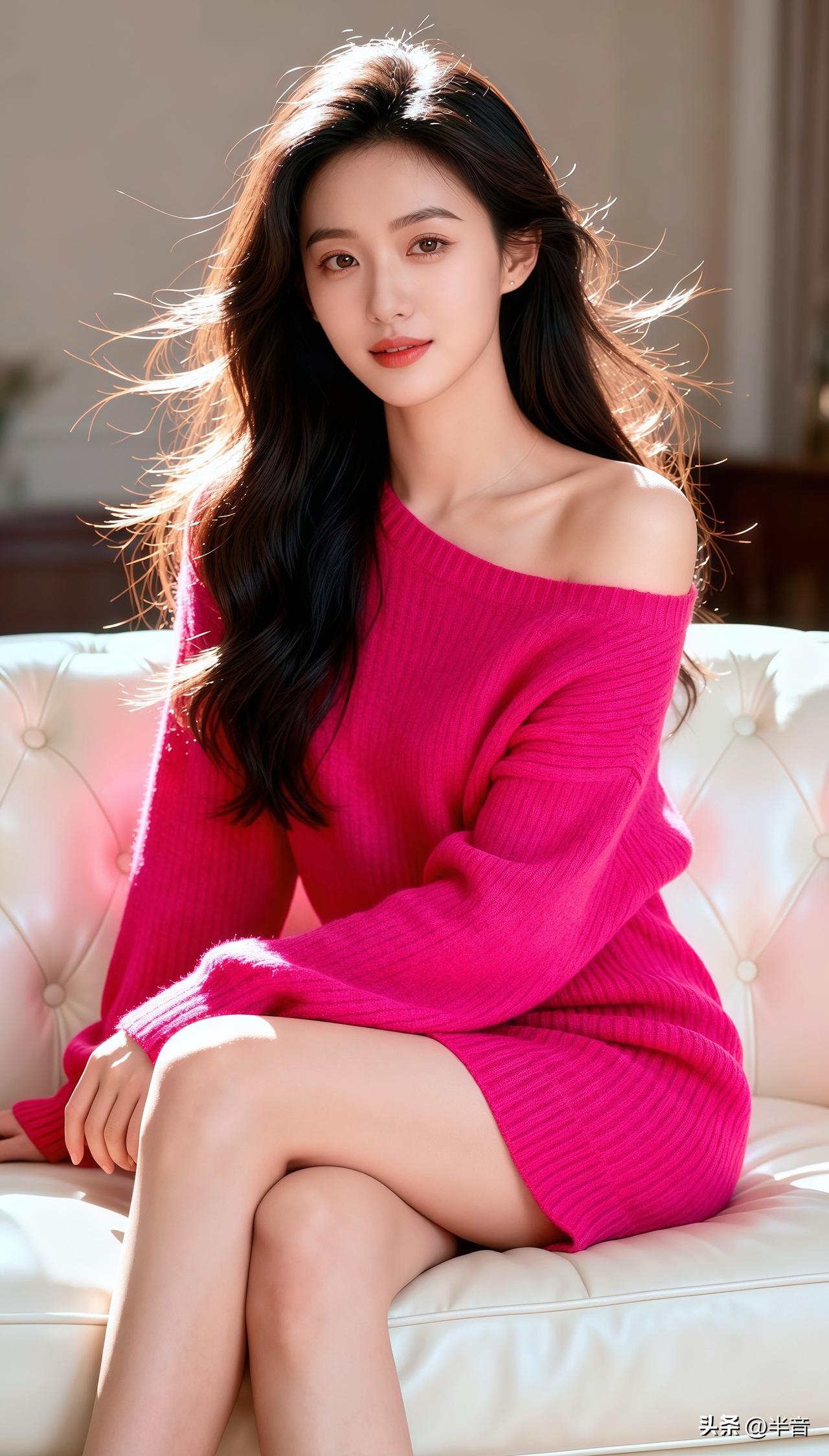 这抹玫红撩到心尖上了~ 玫红毛衣滑落的弧度 刚好盛住一缕温柔