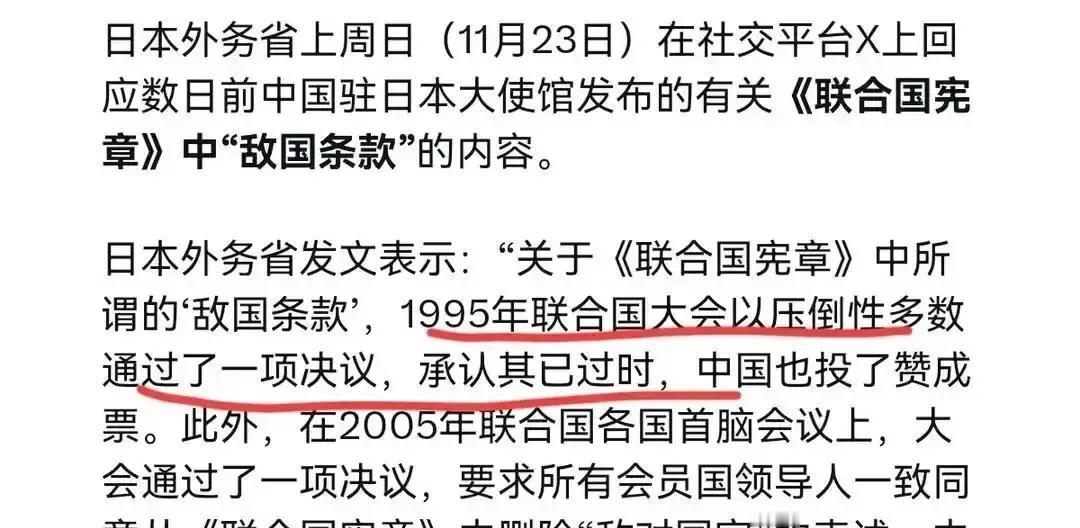 就在刚刚 日本外务省突然宣布了。 中方驻日使馆此前刊出《联合国宪章》“敌国条款”相关内容;日方回应称,1995年联大以压倒性多数通过决议承认该条款“已过时”,中国当时“投了赞成票”;并指2005年联合国首脑会议通过决议,会员国领导人“一致同意删除‘敌对国家’表述”,批评中方信息“与联合国已作出的决定不符”。部分中方舆论强调,“联合国并未正式删除相关条款,相关决定具建议性质”,呼吁“防止历史问题被淡化”。 这件事表面是宪章条款的文字之争,实则藏着三层深意。首先得搞懂,“敌国条款”不是普通文字——它是二战后给德日战败国套的“紧箍咒”,限制军事扩张、绑定历史责任。现在日方拿“过时”说事,中方强调“未正式删除”,本质是历史认知与现实利益的碰撞。 日方为啥此刻挑明?我看有两个算盘:一是想甩历史包袱,为扩军找法理依据。最近日本防卫预算破纪录、搞远程导弹,都需要“松绑”的理由;二是借题发挥拉拢盟友,配合美国亚太战略。美日同盟正深化,台湾问题上日本也越界,这个争议刚好能当“筹码”,给中国施压。 中方的坚持也不是无理取闹。联合国宪章的修订得走法定程序,不是靠“政治共识”就能抹掉条款。更关键的是,历史不能被淡化——如果连二战战败国的约束条款都能随便“过时”,那南京大屠杀、731部队这些历史真相,是不是也要被改写?这是底线问题,容不得含糊。 接下来的走向值得关注:短期双方舆论会继续攻防,美国大概率会站日本那边,中方媒体会聚焦历史责任;中期可能有外交磋商,但能不能降温,要看有没有突发事件(比如台湾方向的动作);长期来看,宪章修订门槛极高,这个争议可能会持续很久,成为地区博弈的一个“常考点”。 其实这件事给我们提了醒:历史问题从来不是“过去式”。日本越是想淡化,我们越要守住底线。国际秩序的根基是二战后的结论,要是连这个都动摇,和平就危险了。希望日方能正视历史,别再玩文字游戏——真要改善关系,先把态度摆对再说。你觉得这件事最终会怎么收场?欢迎留言讨论