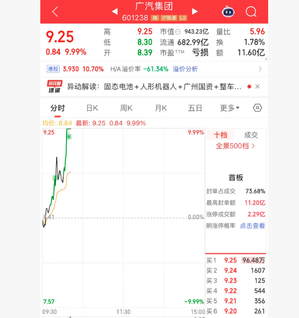 上证报中国证券网讯(记者李五强)11月28日10:05,广汽集团盘中涨停,报9.25元/股,截至10:11,成交额11.60亿元,封单高达96万手。广汽集团H股亦涨逾10%。