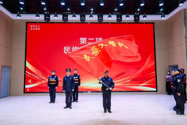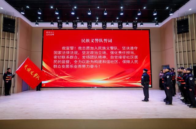 如果说消防安全教育是夯实基础,那么“民族义警队”的成立,则为基层安全网络注入了一支有生力量。在全体与会者的见证下,民族派出所所长陈培建将队旗郑重授予义警队。随后,在副所长、义警队长涂戈的带领下,全体队员举起右拳,庄严宣誓。这支扎根社区的新生力量,标志着民族街道群防群治体系迈上新台阶。