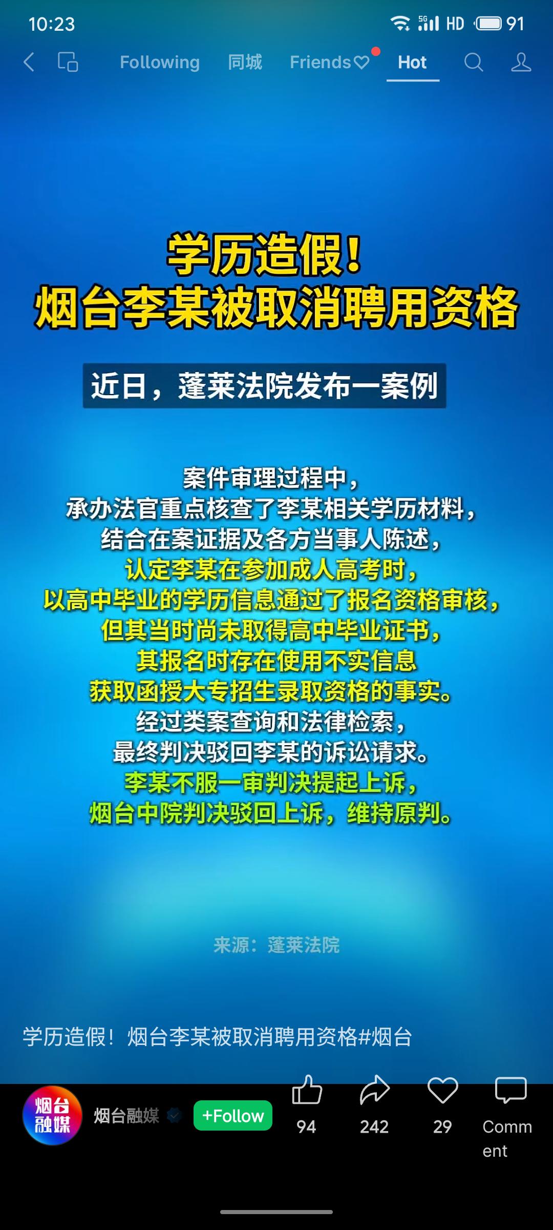 烟台李某在事业单位招聘中通过笔试面试后,因在成人高考报名时使用未毕业的高中学历信息,被查实学历造假。人社局取消其聘用资格,李某先后提起行政复议和诉讼,均被维持原判。