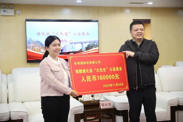11月26日,好邻居股份有限公司总经理陈志伟带队到德化县考察调研,并向德化县“大先生”公益基金捐赠16万元。县长吴志朴出席捐赠仪式。