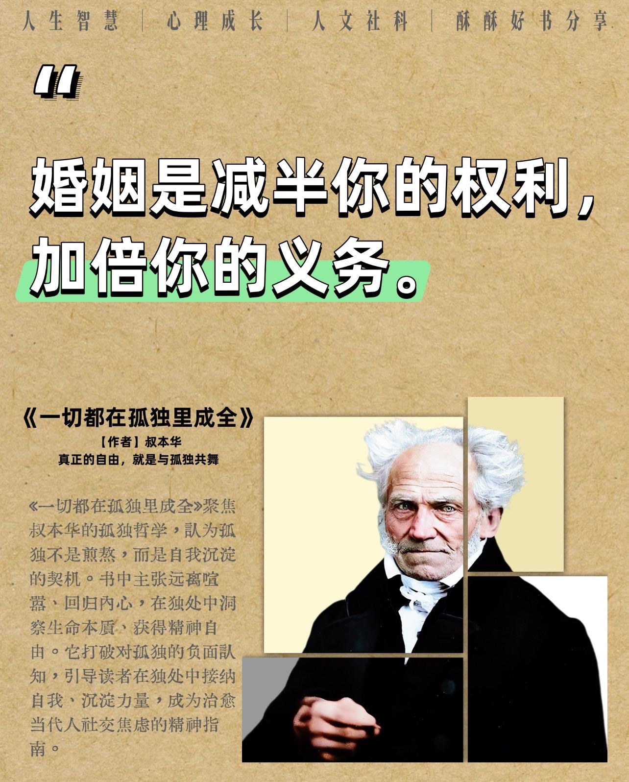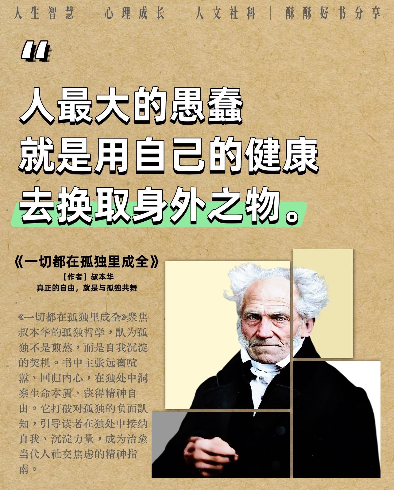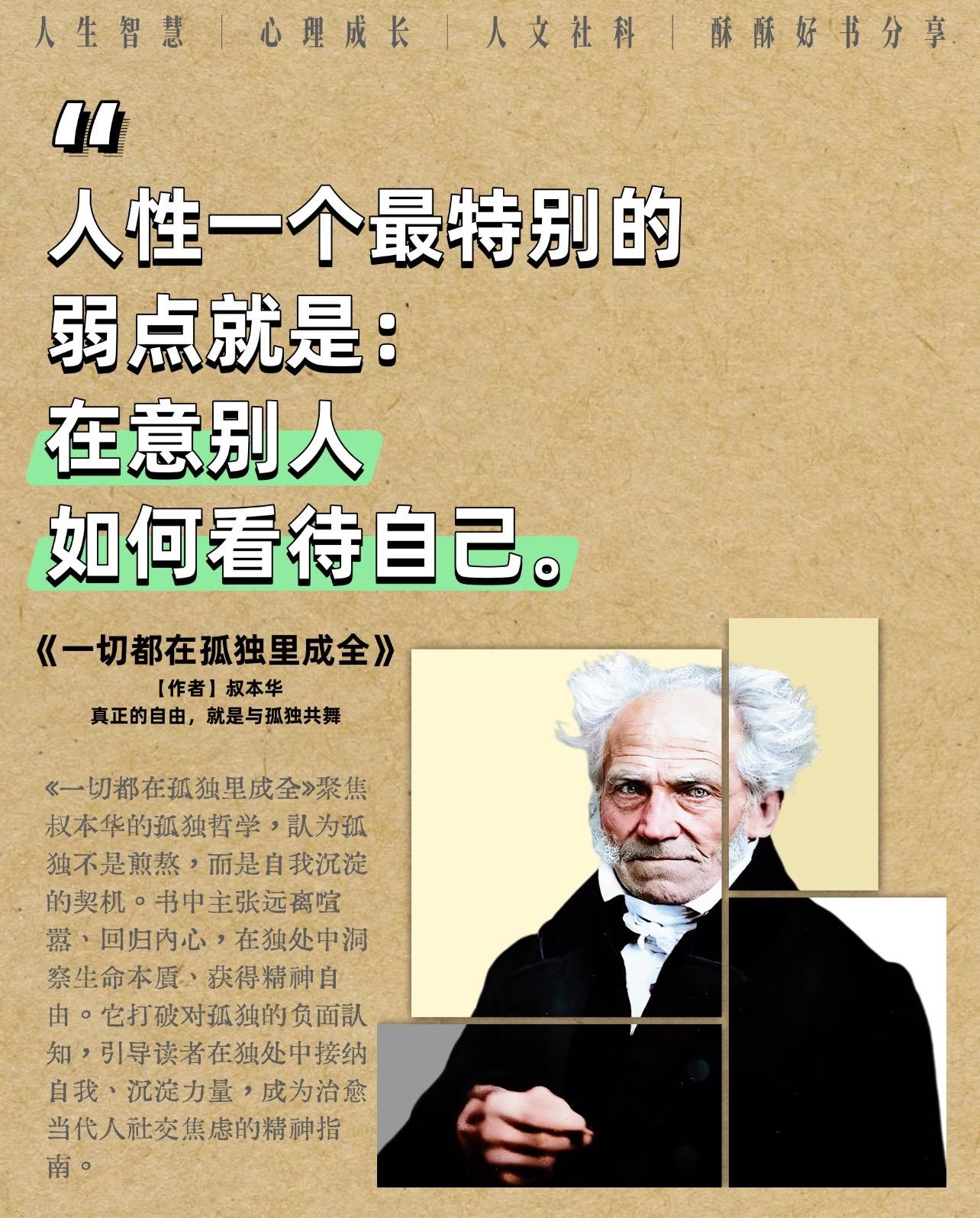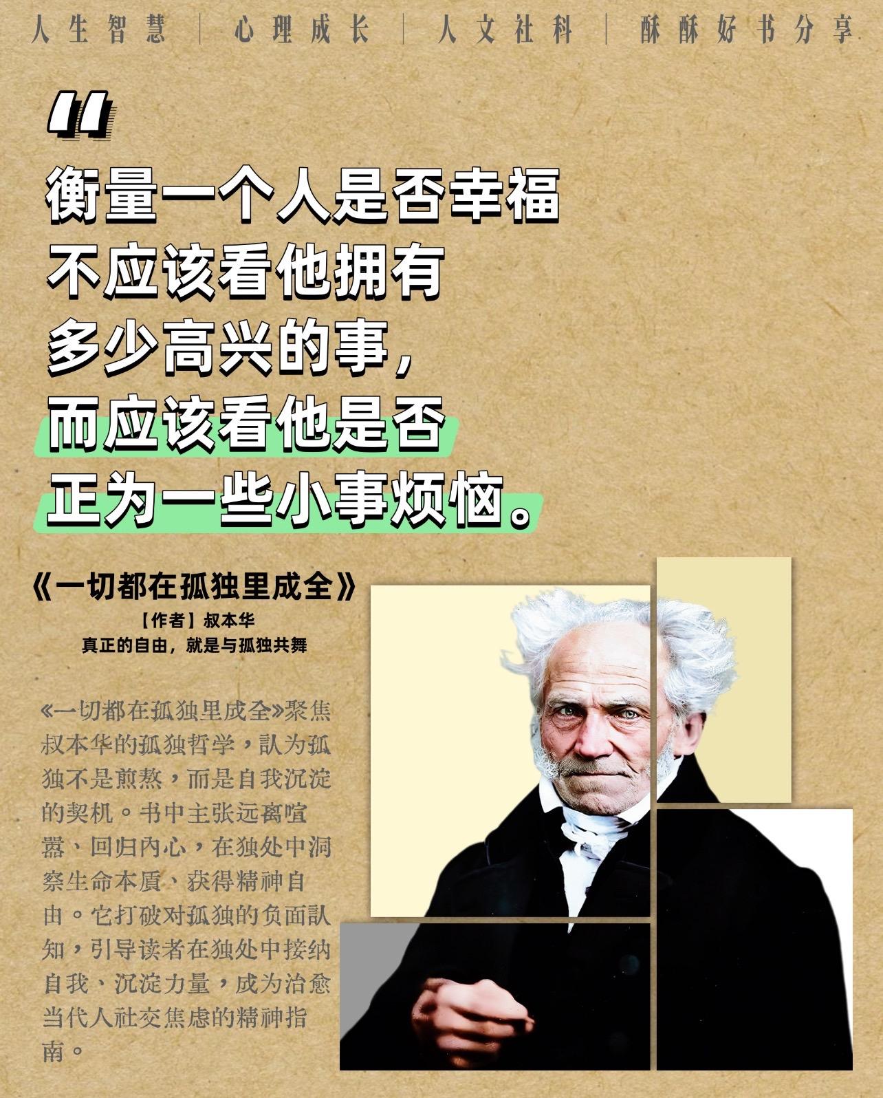 孤独不是不幸,是自我成全的开始!谁懂啊!叔本华把孤独的真相说透了!《一切都在孤独里成全》写道:唯有独处时,人才能做真正的自己;不喜欢独处的人,实则不懂热爱自由。可怜人在孤独中放大不幸,聪明人却在独处里拥抱高尚与伟大。愿我们都能接纳孤独、享受孤独,在独处中成就更好的自己~