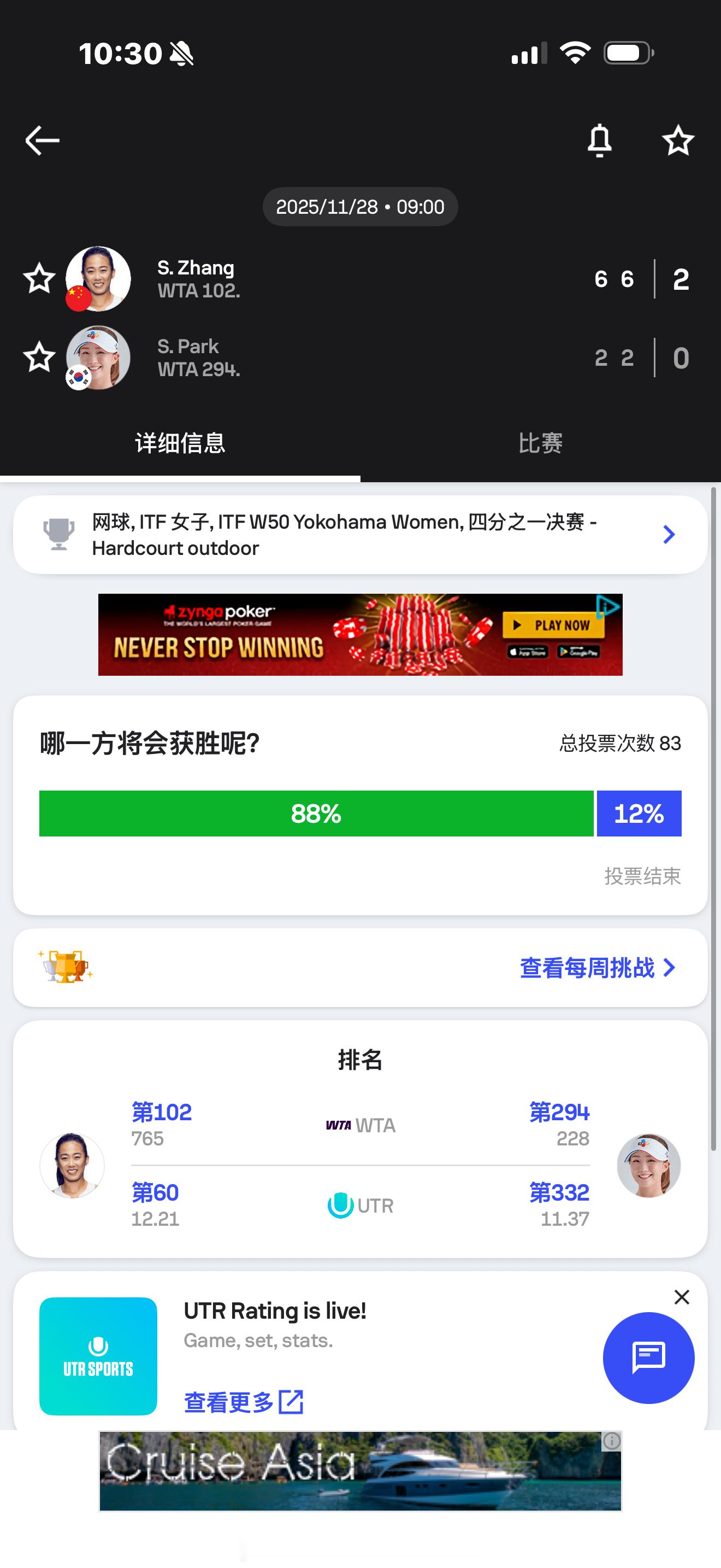 【四字形容】张帅单打世界排名重返前100张帅6-2 6-2朴秀炫打进横滨50K四强。拿到20分、即时排名96位。下周确定回到前100。36岁的张帅还能战斗。