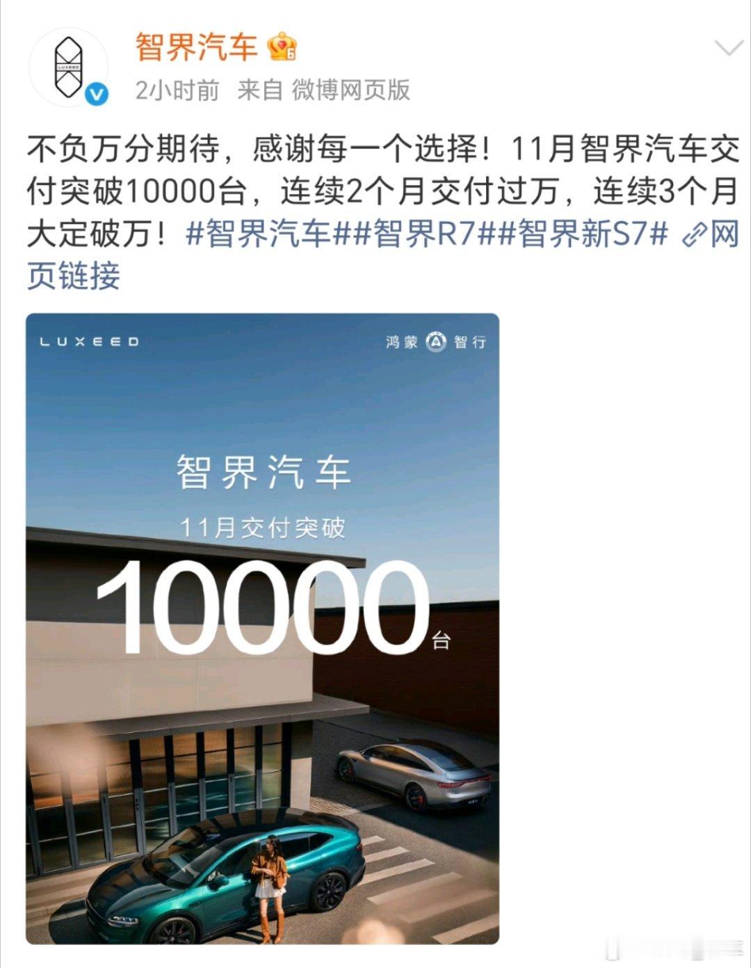 11月28日,鸿蒙智行智界汽车官宣11月交付再破万台,实现连续两月交付过万、三月