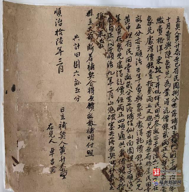 立契人黄升泰,原已有民园捌分,坐落埔埕玉梅门前,于顺治五年十月卖与陈象先为业,得訖价银贰两正;又族叔黄登玄缴卖格洋东坡下并坑坪民田共叁亩,亦于顺治六年卖在象先处,得价银壹拾贰两正;又胞兄黄瑨原有格尾民田壹亩五分,亦于顺治五年卖与象先处得訖价银陆两;又兄黄中理有民园壹亩贰分,坐落埔埕仙山面围裡,亦于顺治六年卖在象先处,得訖价伍两正。四项通共载价银贰拾叁两正。因于顺治九年二月,山寇破寨失落原契,昨升泰呈推割,求蒙县主大爷断着补契,合将原价亩数补明付照。