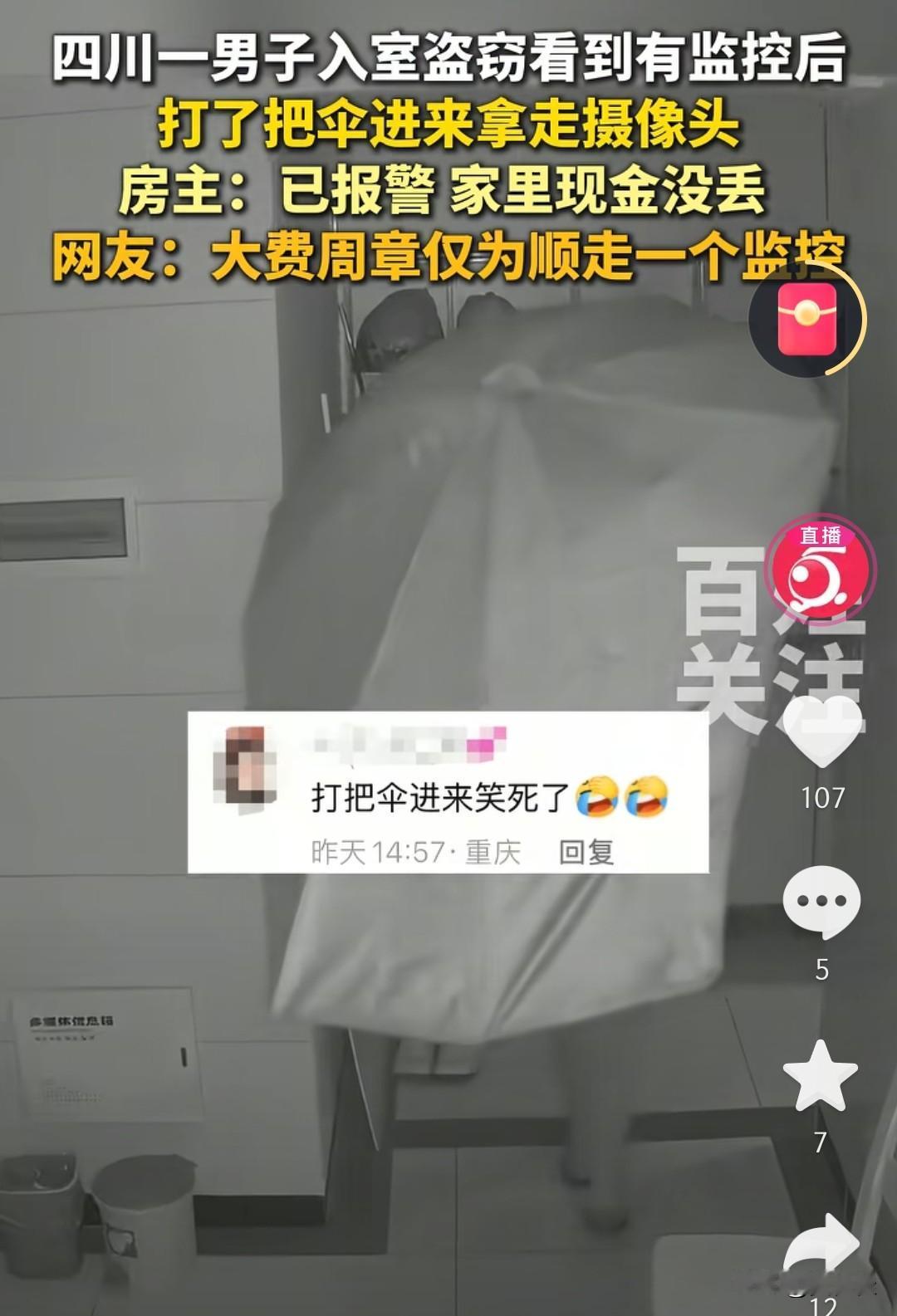 合着他就偷了个监控走了?四川这小偷可太“精准作案”了——入室看见摄像头,居然打伞遮脸回来偷监控,现金都没碰。 主打一个“掩耳盗铃”:以为拿走摄像头就能销毁证据,殊不知前面的画面早传云端了。房主报警后一脸懵:除了监控,其他啥都没偷。 大费周章撬门打伞,合着就冲个摄像头来的?这小偷怕不是监控厂家派来的“野生销冠”吧?
