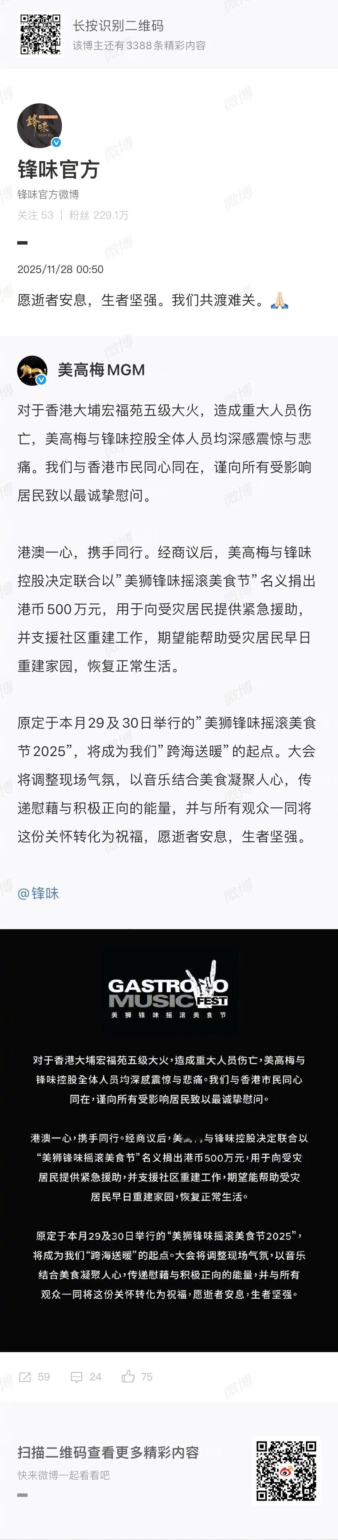 谢霆锋何超琼为香港火灾捐款500万元香港新界大埔宏福苑多栋住宅楼发生火灾,人员伤