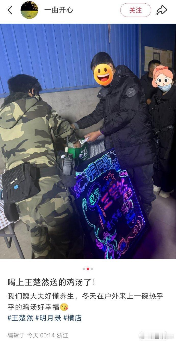 王楚然请剧组喝鸡汤 深夜拍摄的治愈瞬间!《明月录》冬日户外赶工,王楚然的鸡汤暖胃又暖心,温柔举动圈粉无数,狠狠期待魏采薇~王楚然请客剧组鸡汤