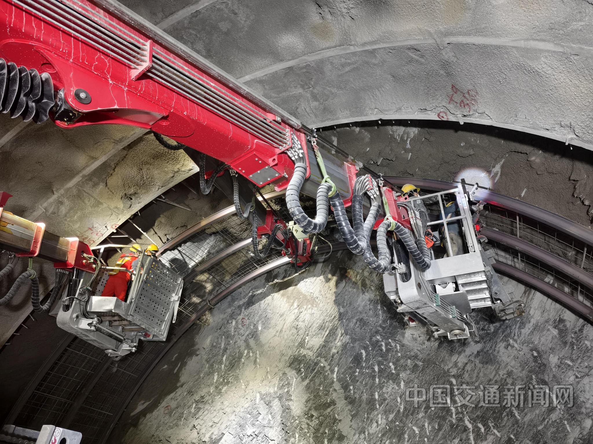 5标项目负责人安三虔介绍,采用“机械兵团”作战后,佛照山隧道掌子面作业人数压减至4人以下。尤其是双曲臂凿岩台车的单孔钻孔效率较人工提升三四倍,智能拱锚台车50分钟即可完成3榀拱架的安装定位。