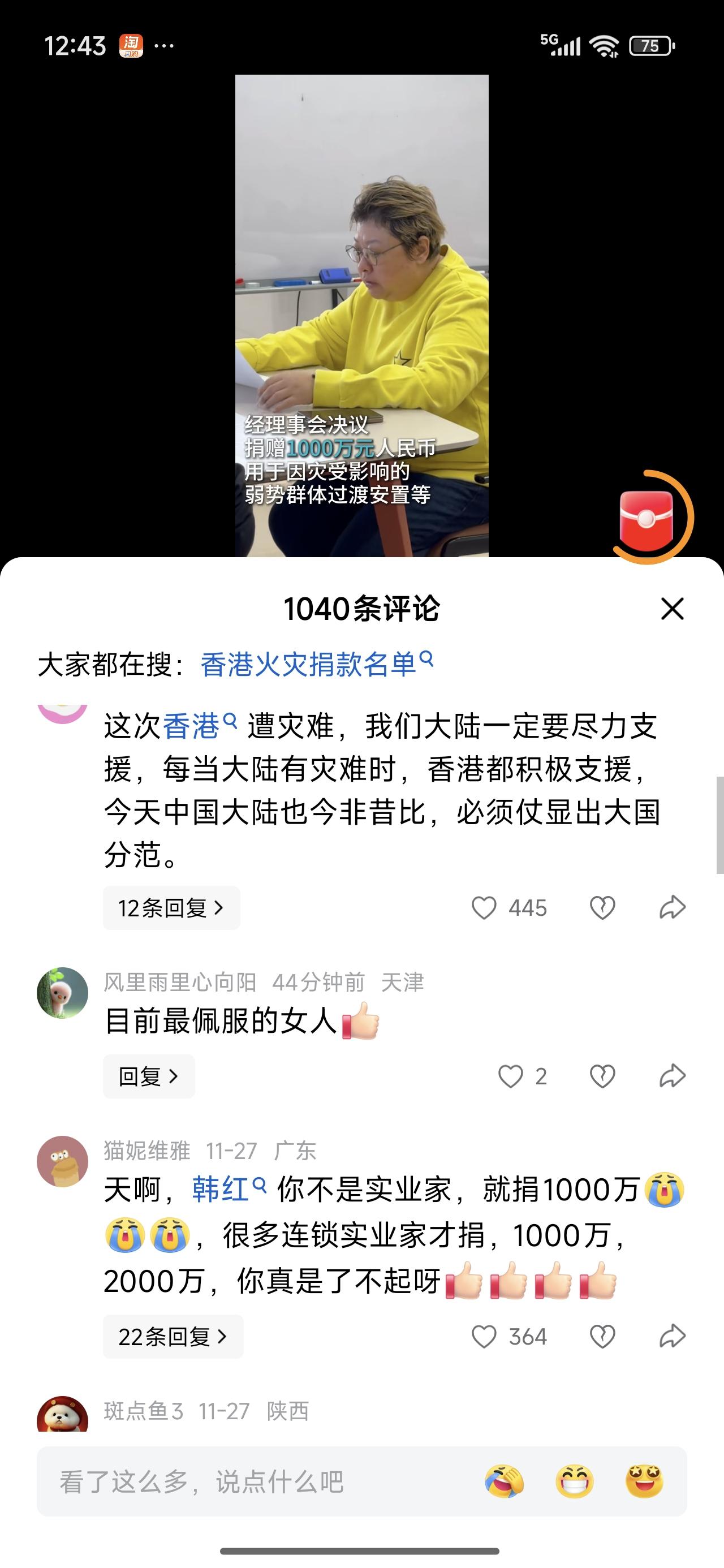 韩红基金会捐款一千万。香港大火,七栋连片烧。 以前读课文,火烧曹操联营,那时候没脑子,觉得烧的好旺啊!过瘾。 能用来烧的,除了士兵,还有金钱,哪一种原材料不是钱堆砌的?! 到了一定的岁数,见不得打打杀杀,火光连天的! 那都是劳动人民的财富,一点一点积累起来的,都是时间和生命的产物! 目前,全世界,醉值得我相信的人,韩红。