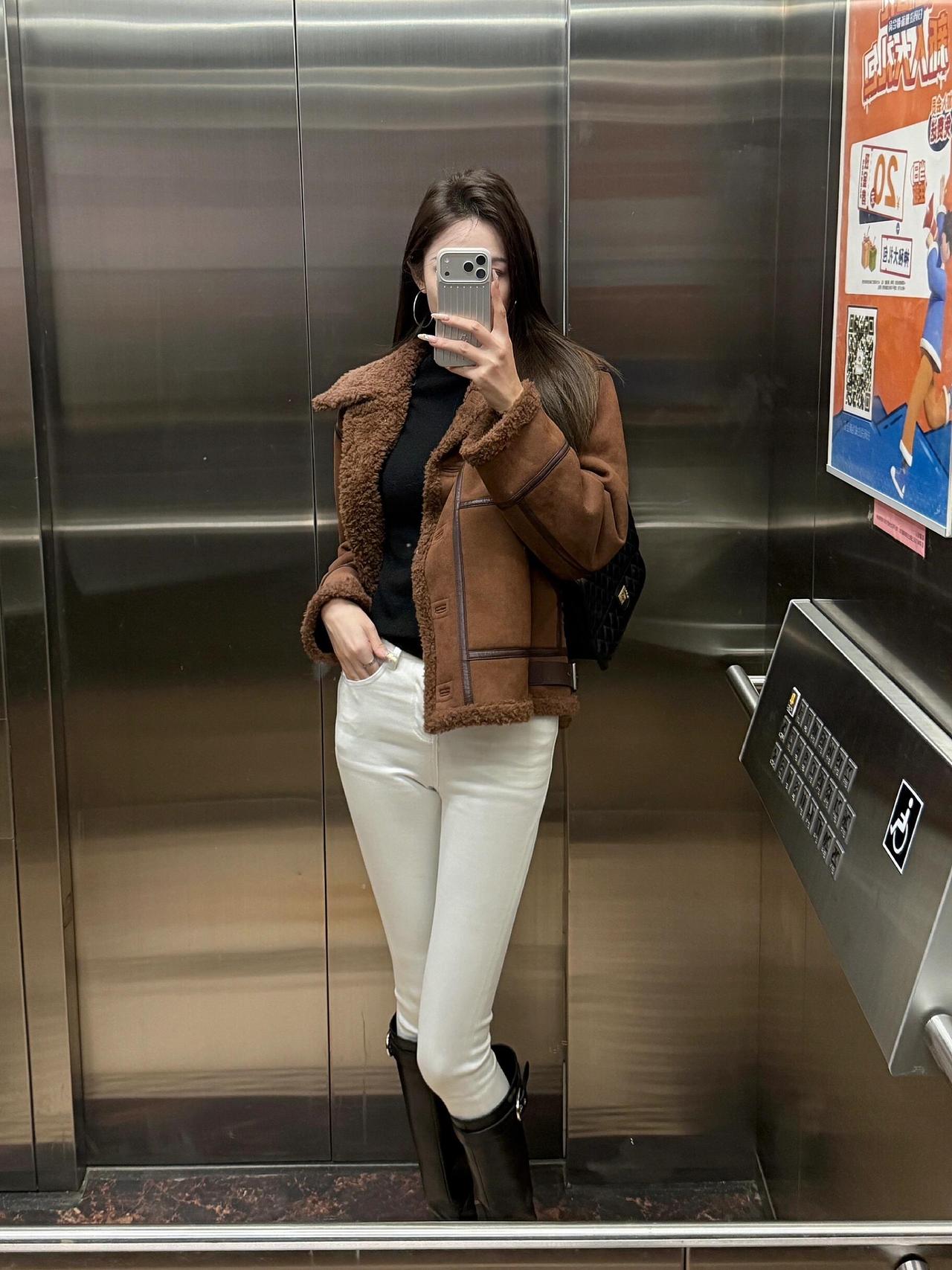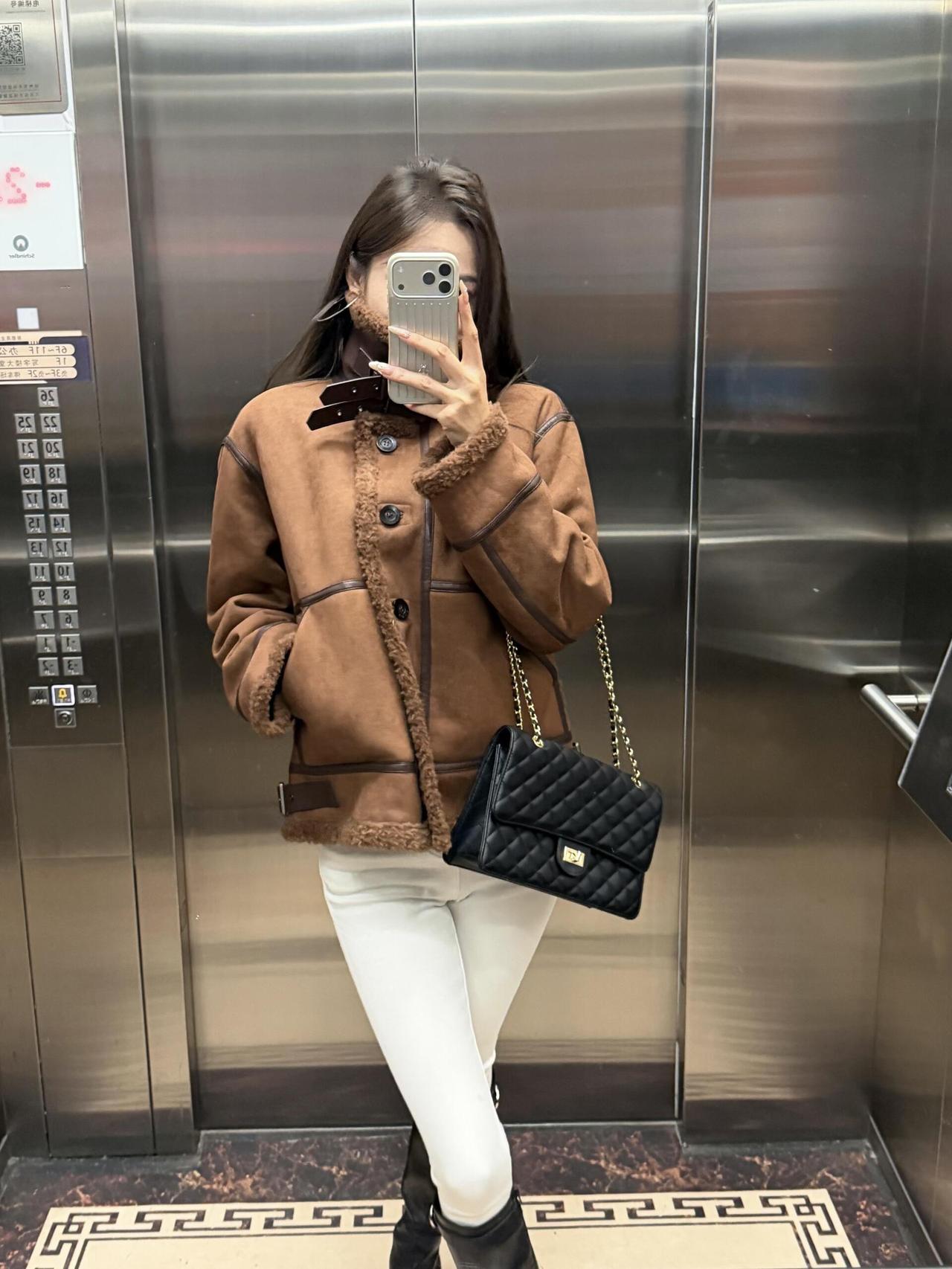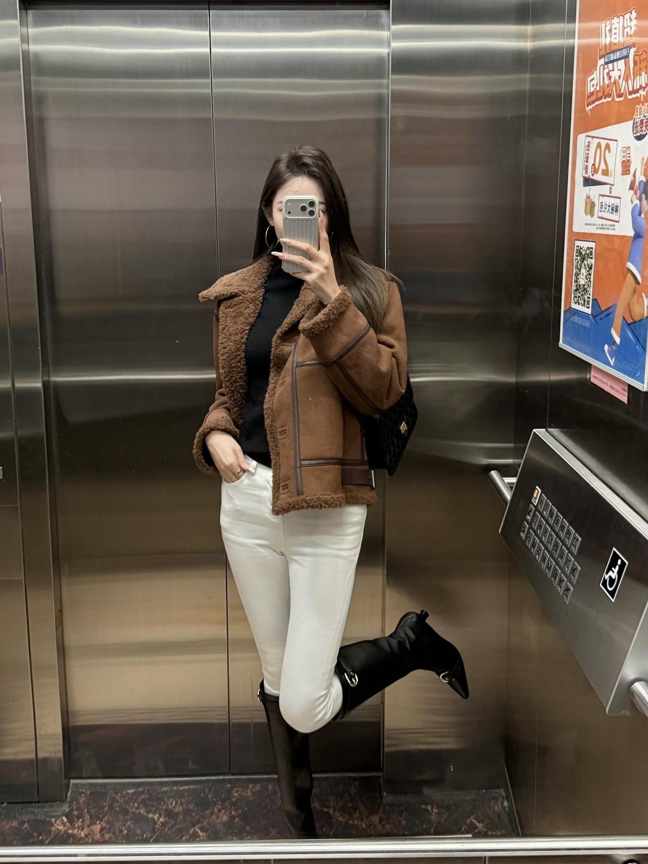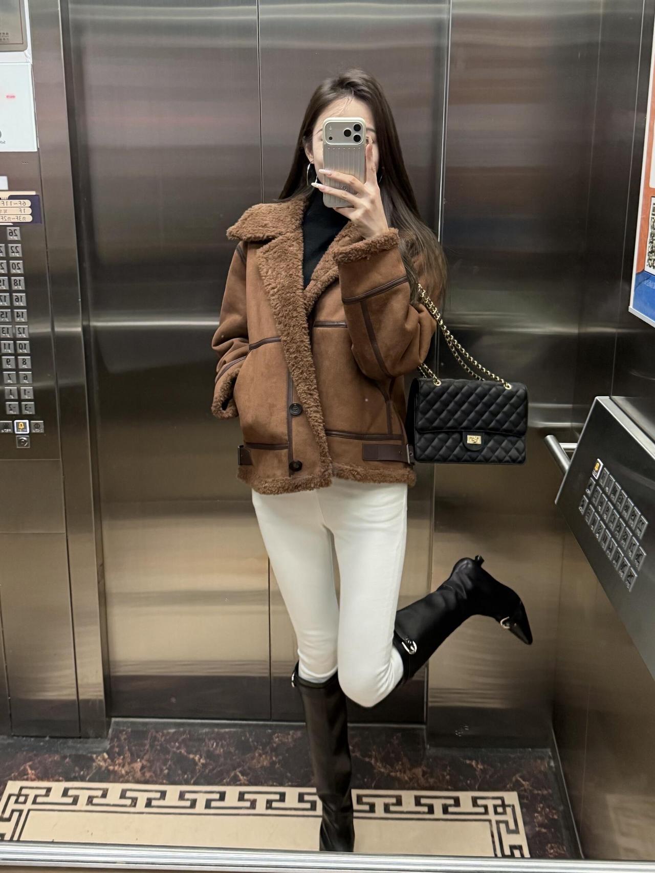 今日推荐:温柔韩系轻熟风,整体搭配舒适又有质感: 焦糖色羊羔毛拼接外套温暖软糯+内搭黑色高领打底简约显瘦+白色紧身裤修饰腿型,平衡了外套的厚重感;搭配黑色菱格纹链条包和长靴,增加精致度的同时提升了气场。 适合的场合:日常逛街、轻商务通勤、冬日下午茶,保暖性时尚不耽误。