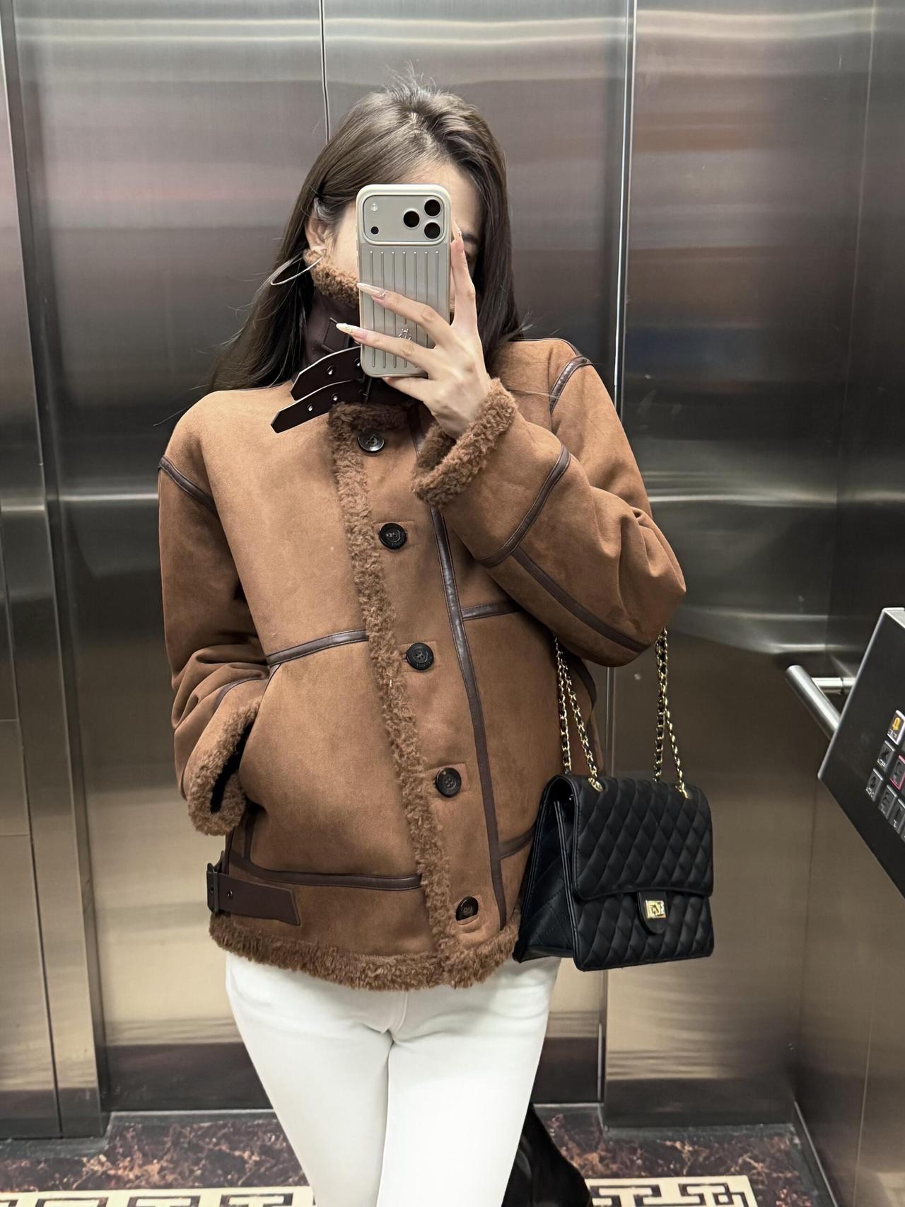今日推荐:温柔韩系轻熟风,整体搭配舒适又有质感: 焦糖色羊羔毛拼接外套温暖软糯