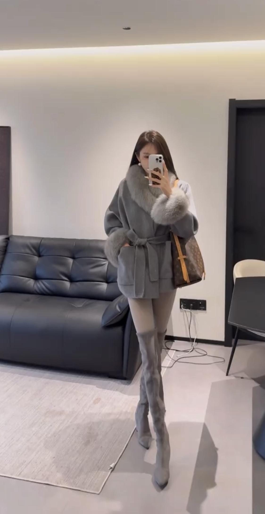 今日穿搭推荐:贵气优雅风,具体搭配如下 上衣:灰色仿貂毛风衣,质感柔软奢华。