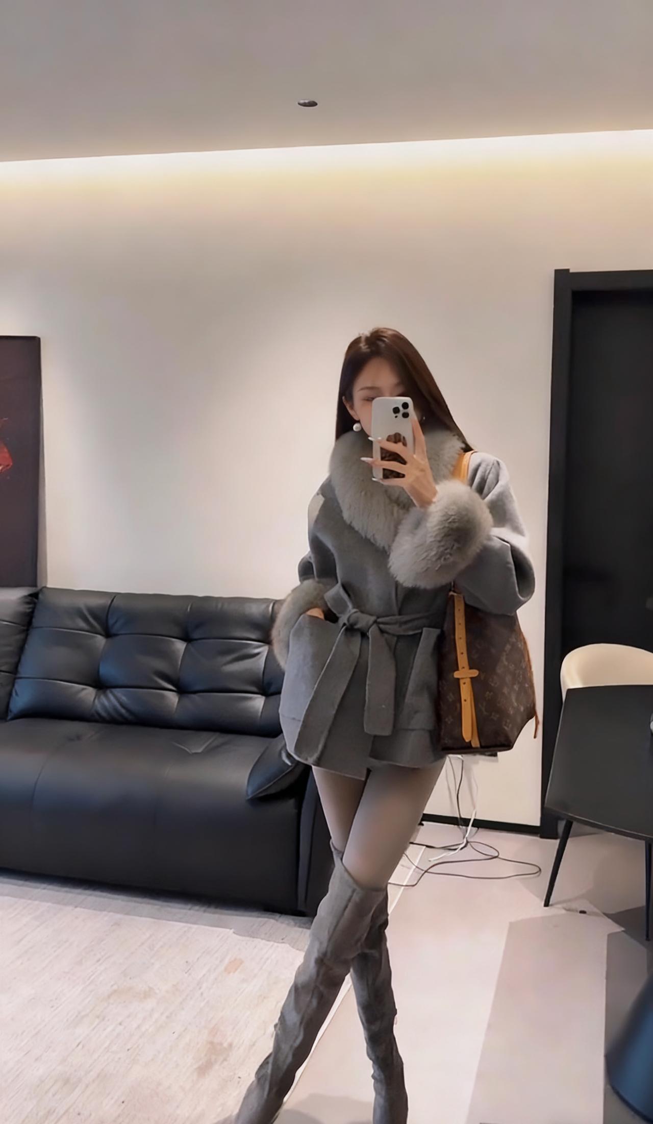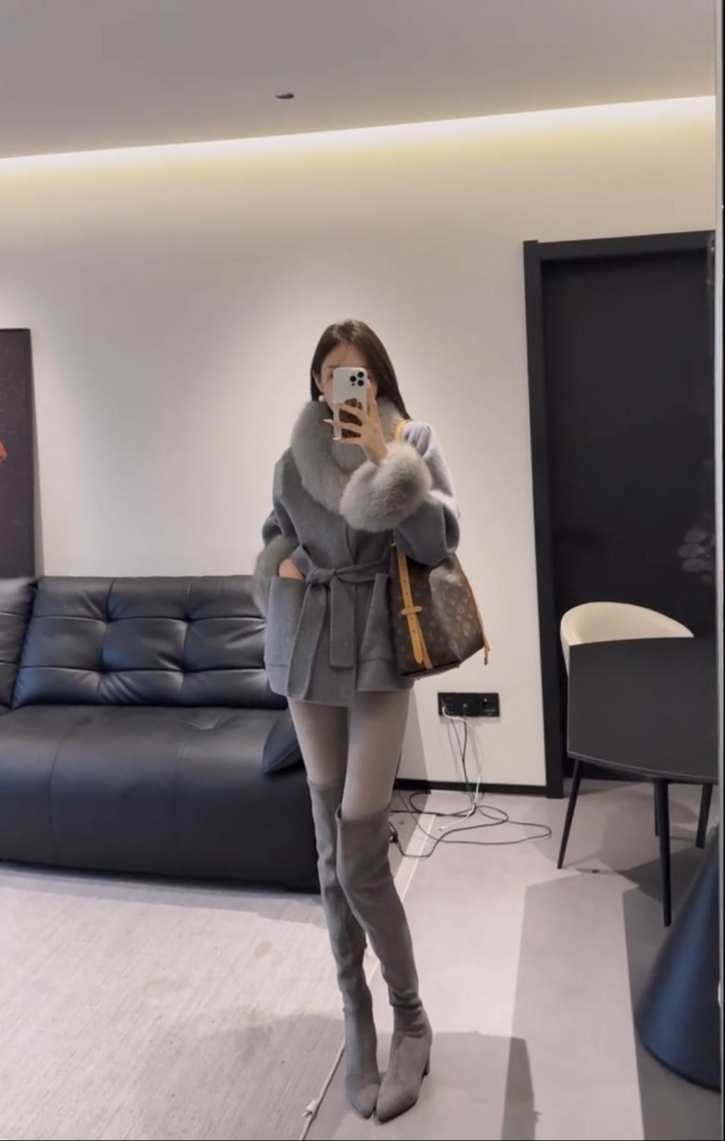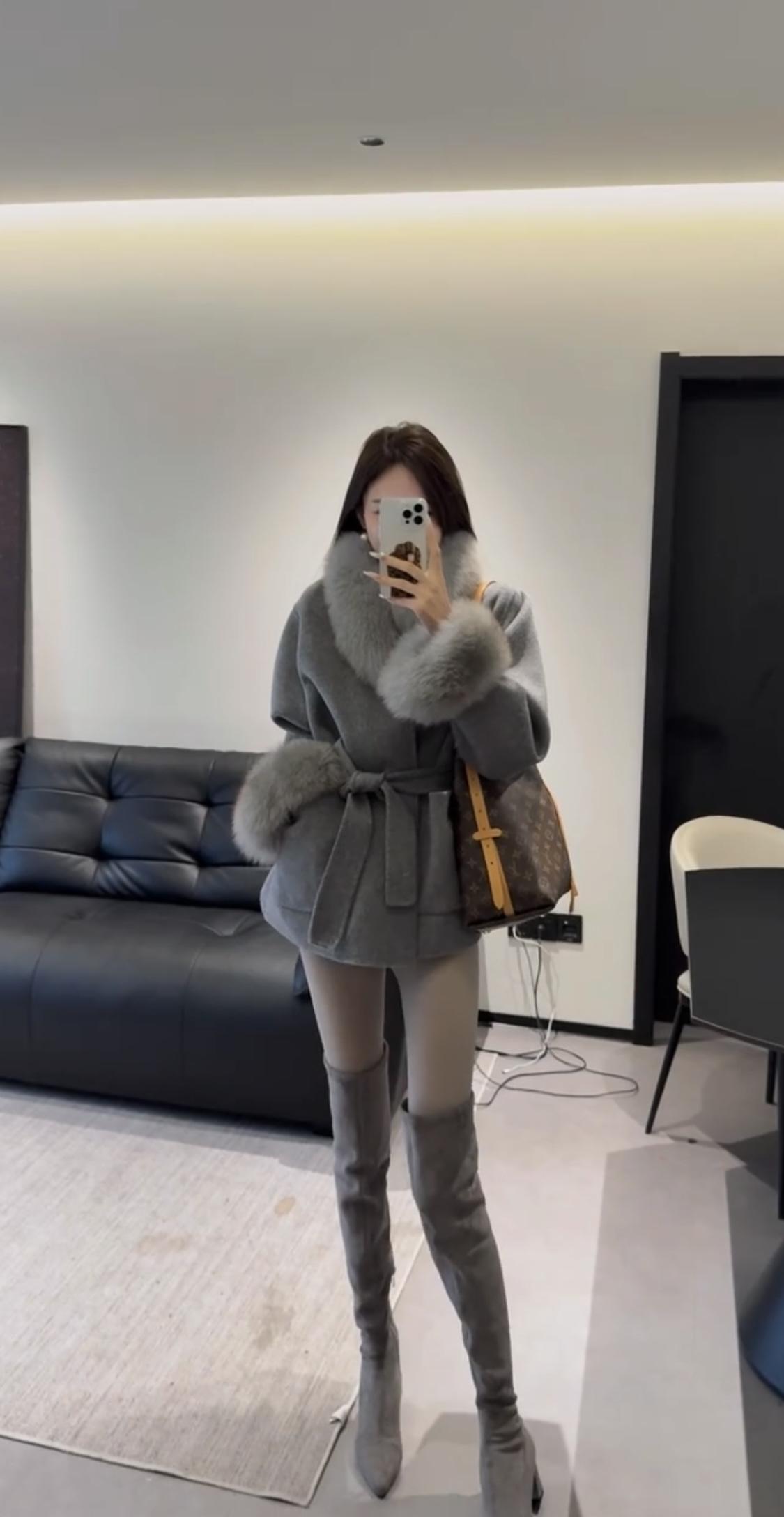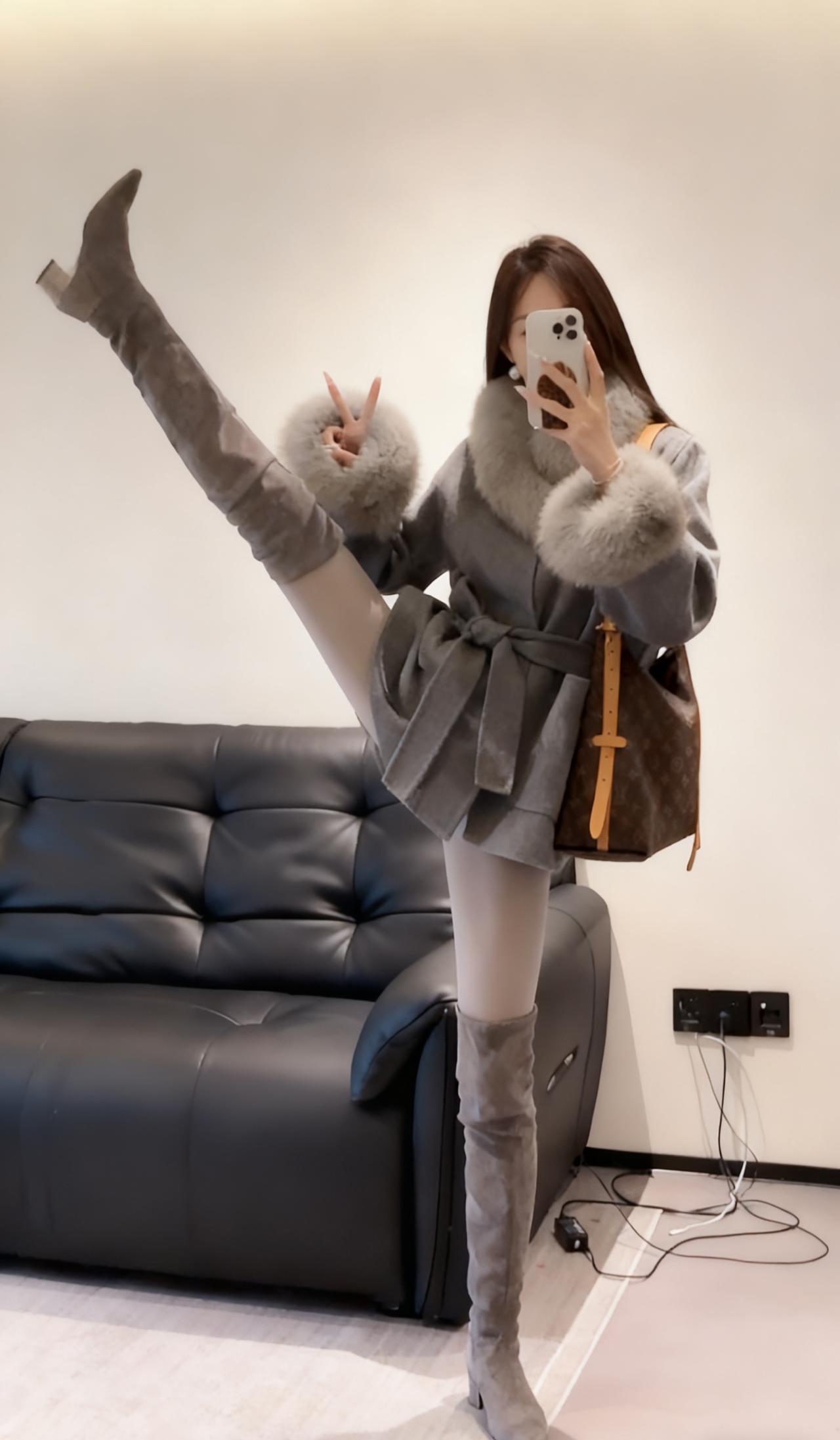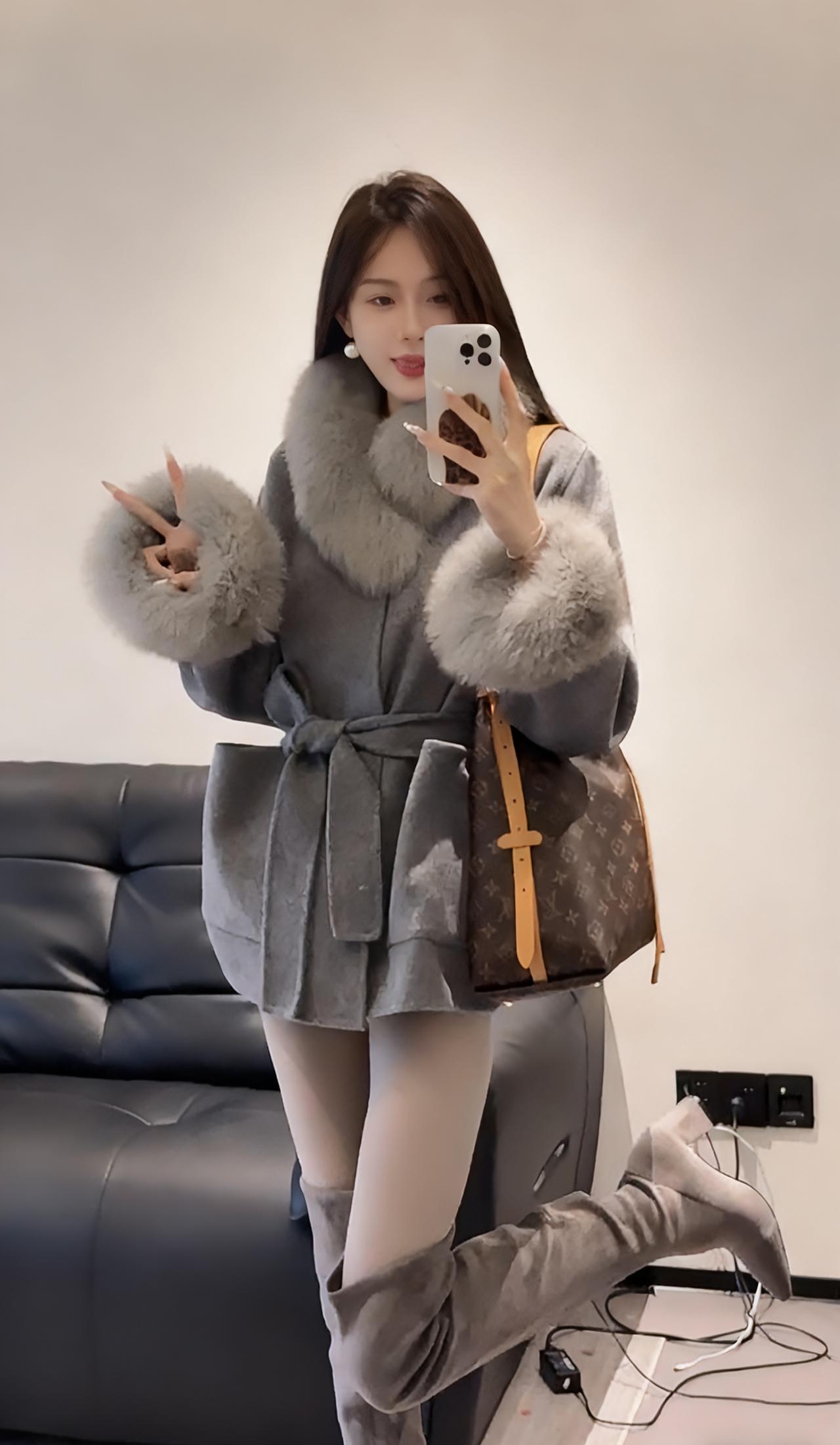 今日穿搭推荐:贵气优雅风,具体搭配如下 上衣:灰色仿貂毛风衣,质感柔软奢华。 下装:黑色短裤紧身短裤+灰色打底裤,简约修身,中和了上衣的厚重感。 灰色高筒靴,棕色带花纹手提包,搭配精致耳饰,提升整体精致度。 适合场合:派对、聚餐、逛街、下午茶、轻通勤,保暖的同时兼顾时尚感,适配都市精致生活场景。