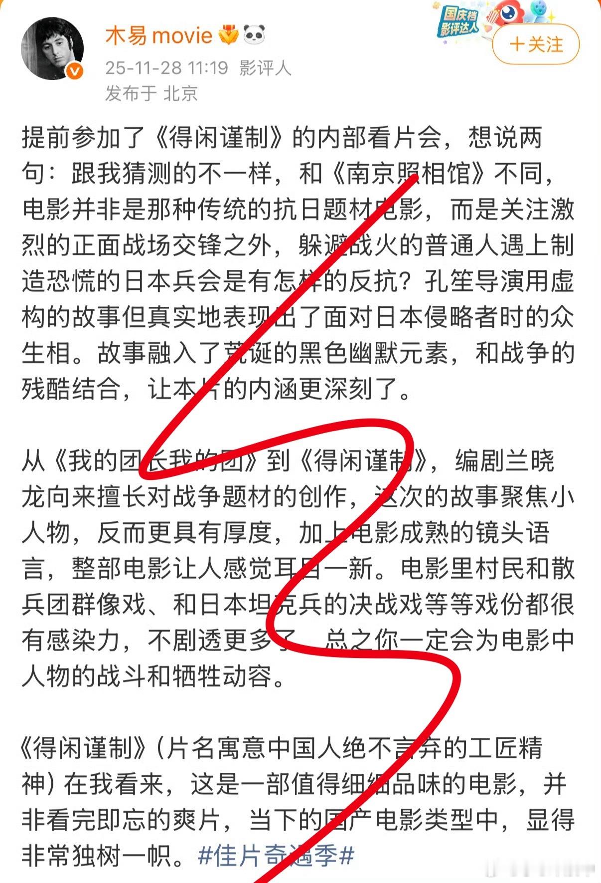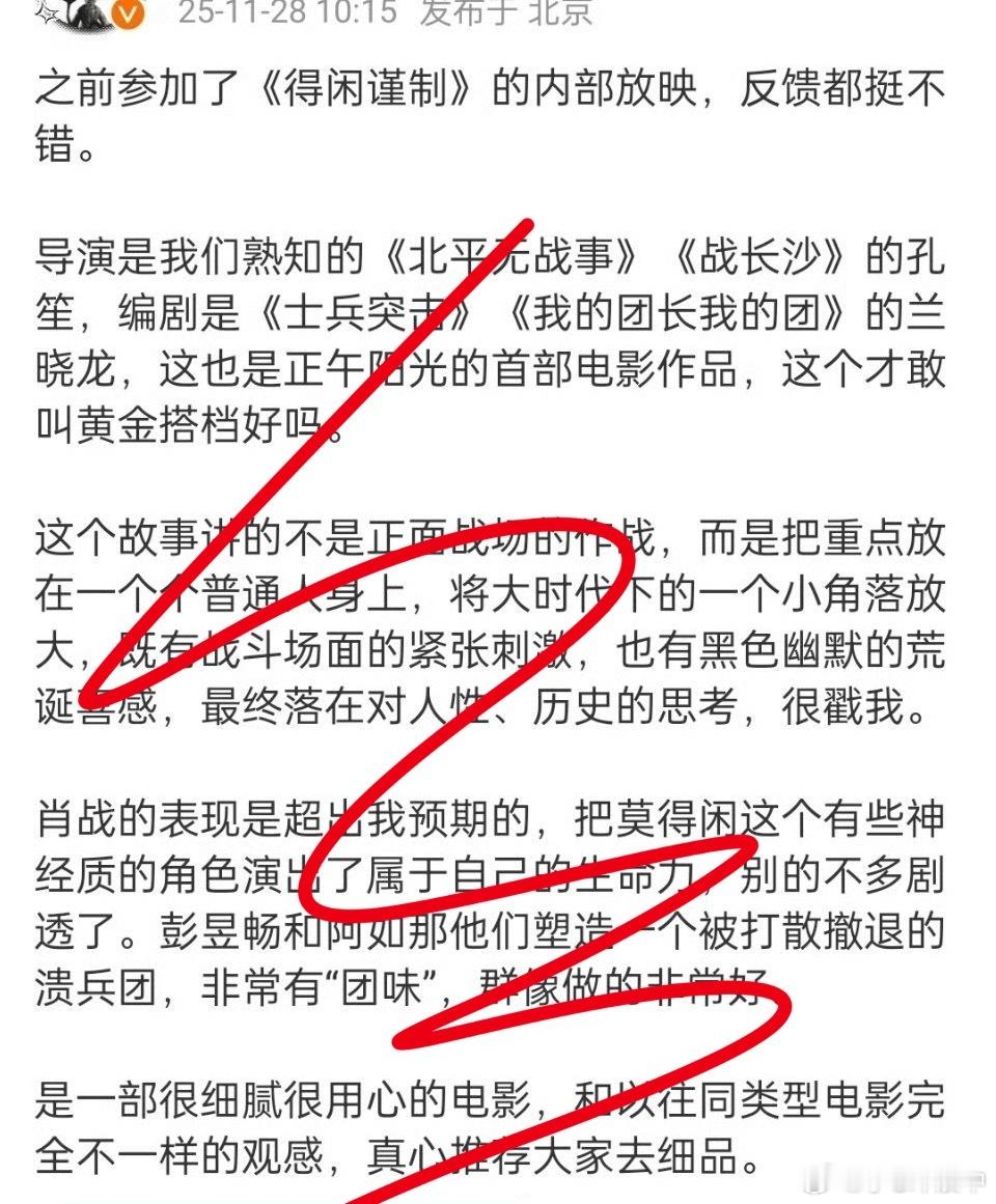 得闲谨制提前看片反馈 电影得闲谨制定档内部观影后的反馈都是很不错的评价!得闲谨制 大事很妙啊!孔笙➕兰晓龙的组合很稳,真正小人物抗日的故事。肖战的表现很不错,把莫得闲这个角色演出了属于自己的生命力。无论风格还是故事内核都和其他战争电影有很大差异化。整体节奏紧凑,立意深刻,小人物及群像塑造特别好,结局很打动人得闲谨制预售票房破100万