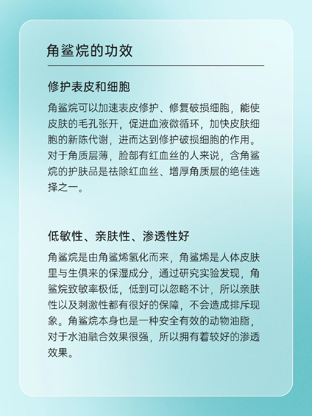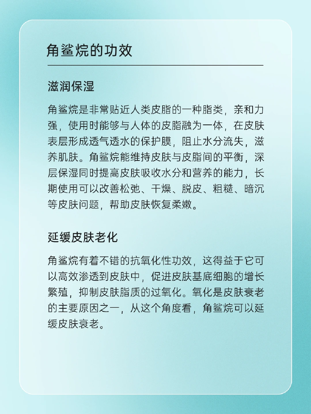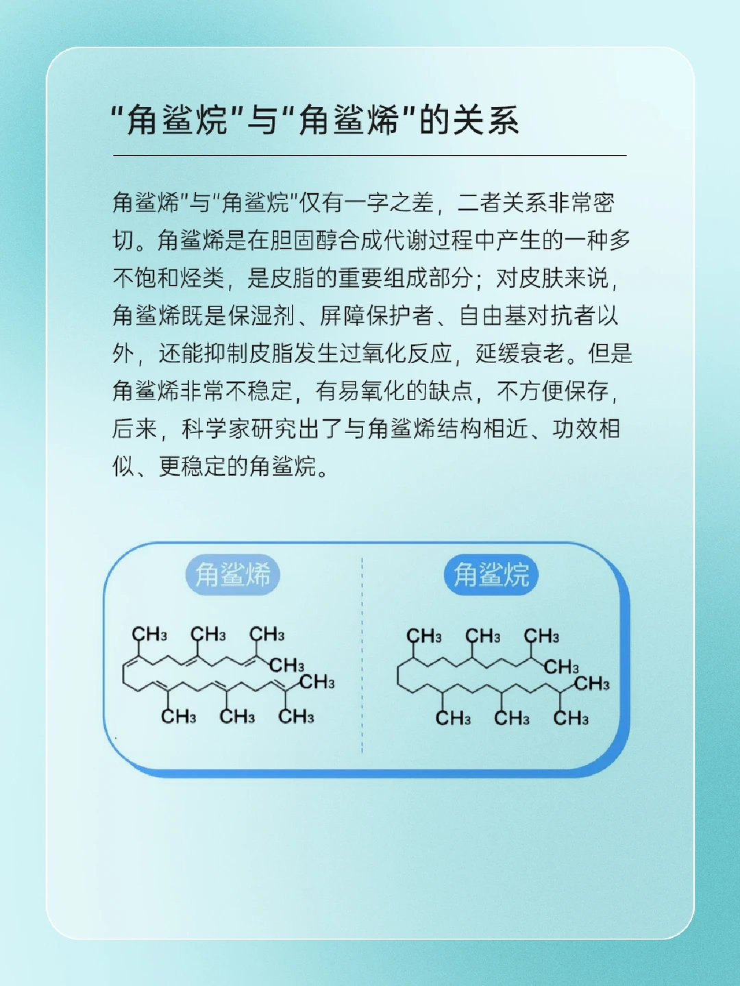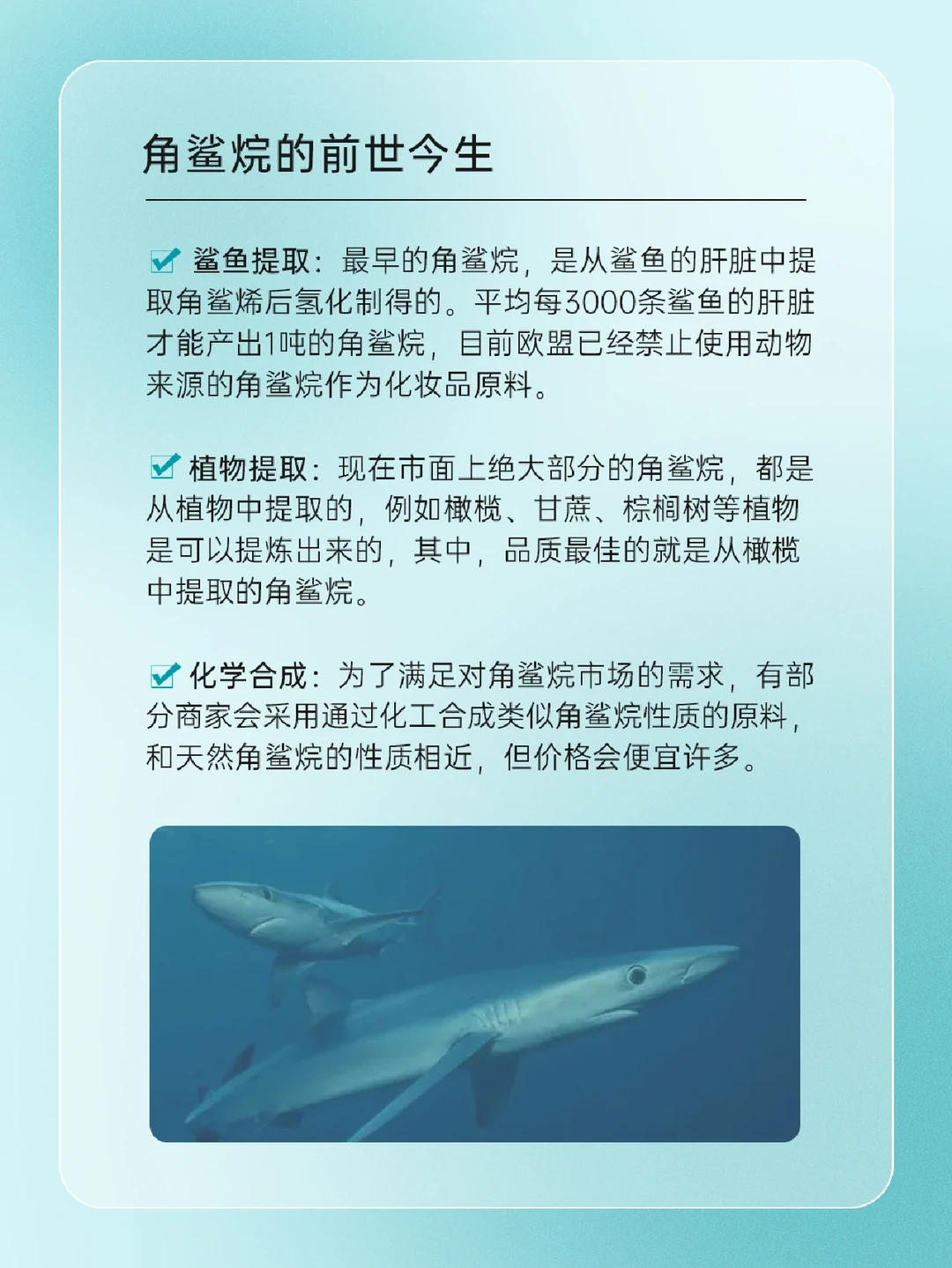 🦈 角鲨烷是什么 🦈“角鲨烷”与“角鲨烯”的关系 🦈 角鲨烷的前世今生 🦈 角鲨烷的功效 • 滋润保湿 • 延缓皮肤老化 • 修护表皮和细胞 • 低敏性、亲肤性、渗透性好 一起来了解一下吧,下期还想看什么可以❤➕🍎告诉我哦