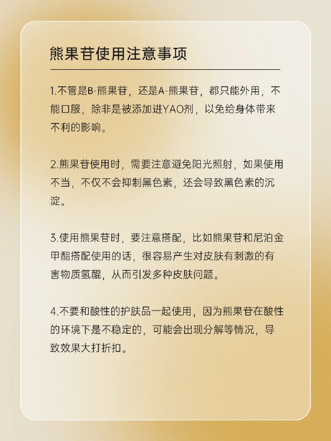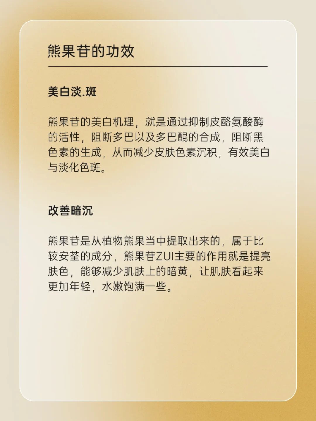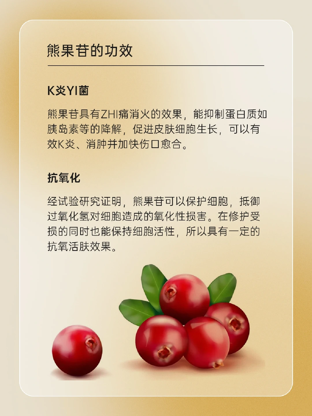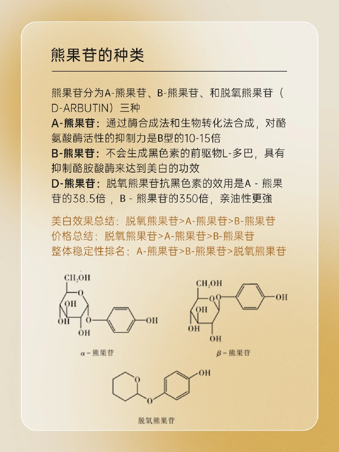 🍒 熊果苷是什么 🍒 熊果苷的种类 熊果苷分为α-熊果苷、β-熊果苷、和脱氧熊果苷(D-Arbutin)三种 🍒 熊果苷的功效 • 美白淡.斑 • 改善暗沉 • K炎yi菌 • 抗氧化 🍒 熊果苷使用注意事项 一起来了解一下吧,下期还想看什么可以❤➕🍎告诉我哦