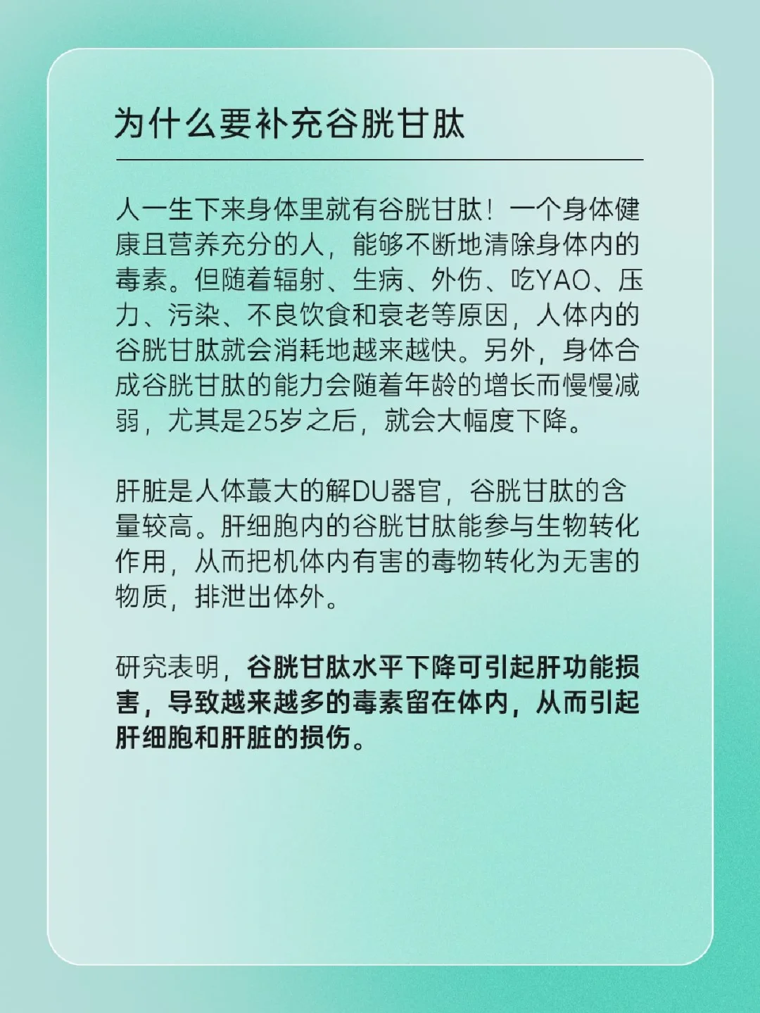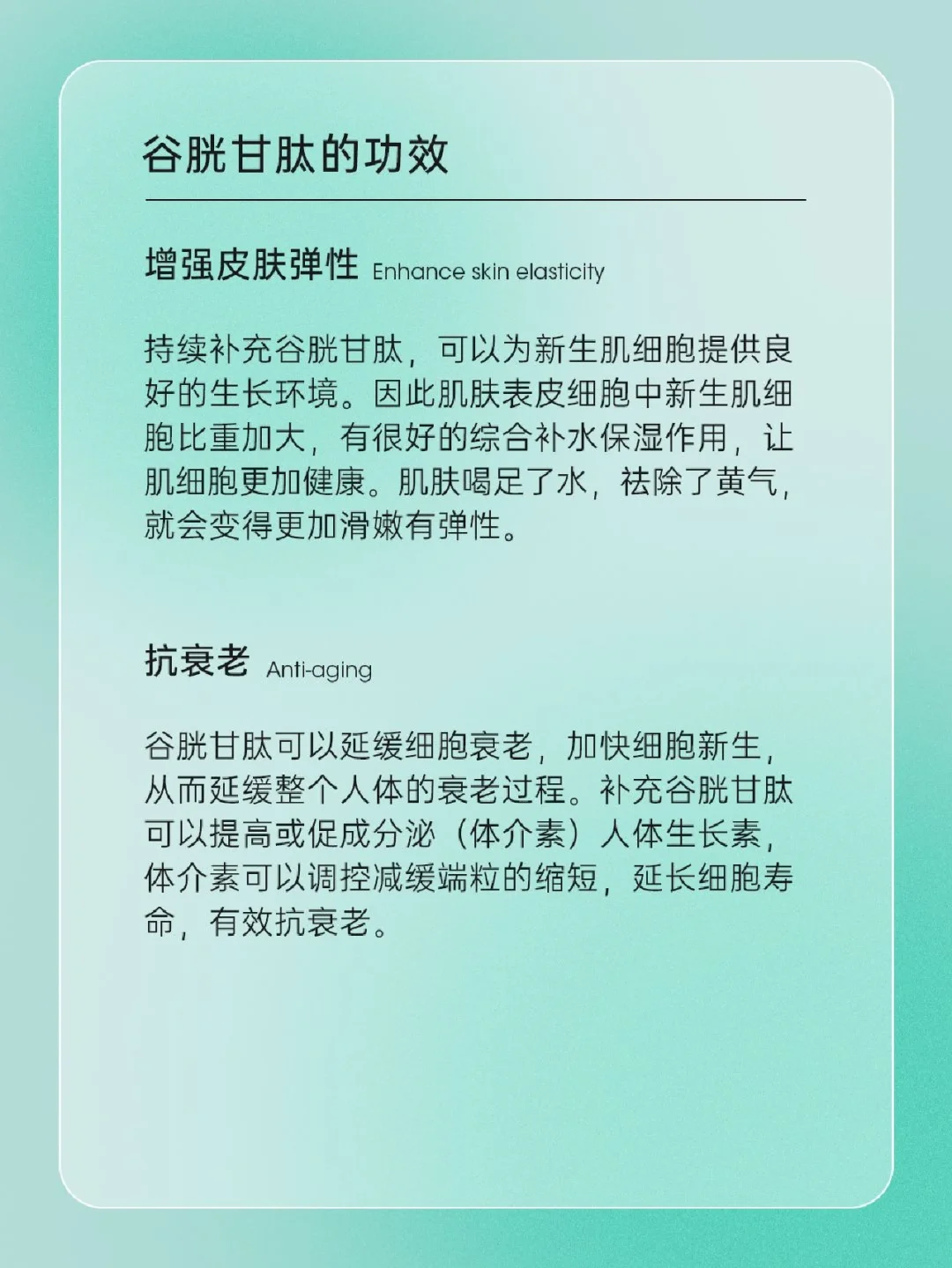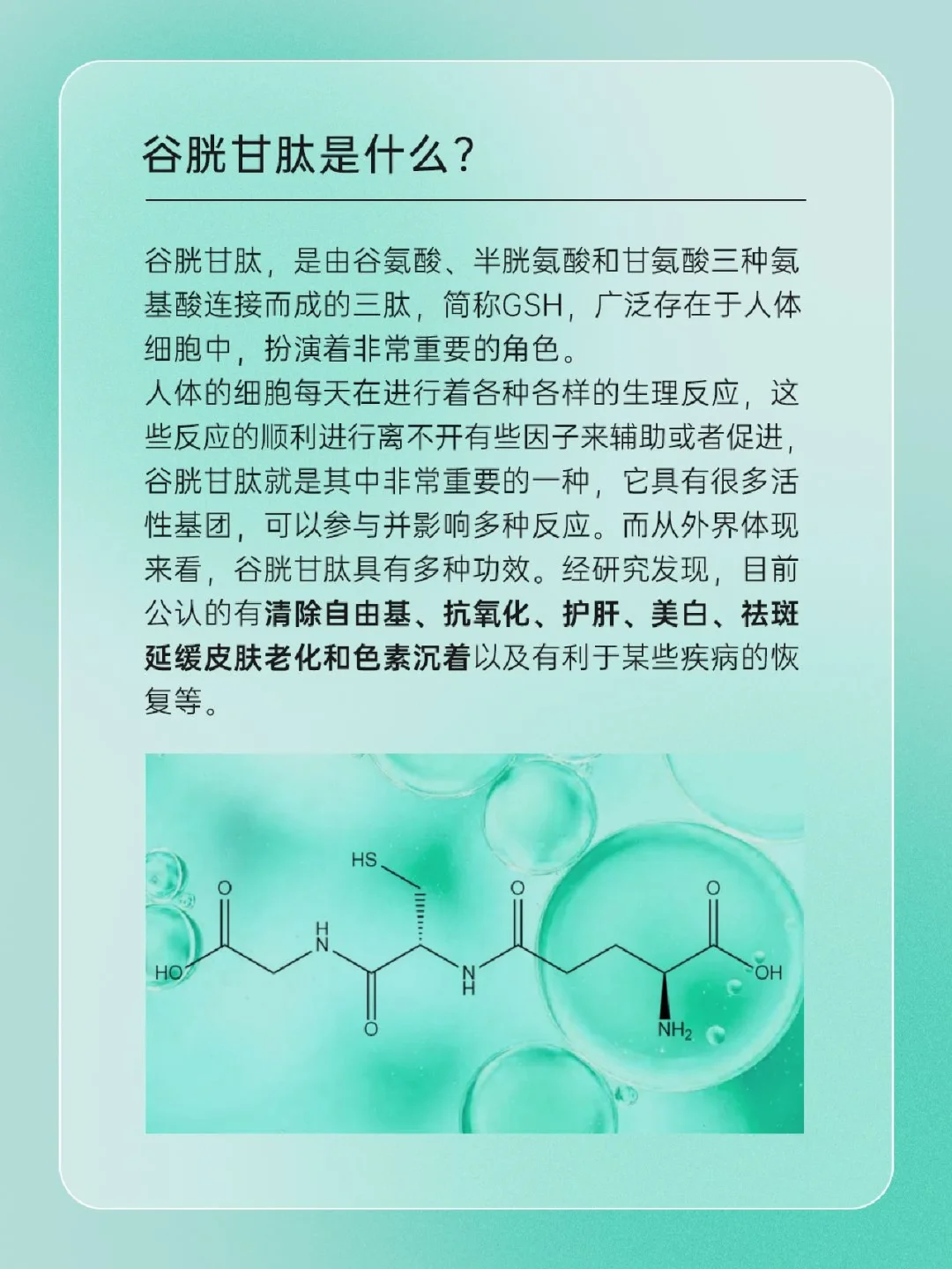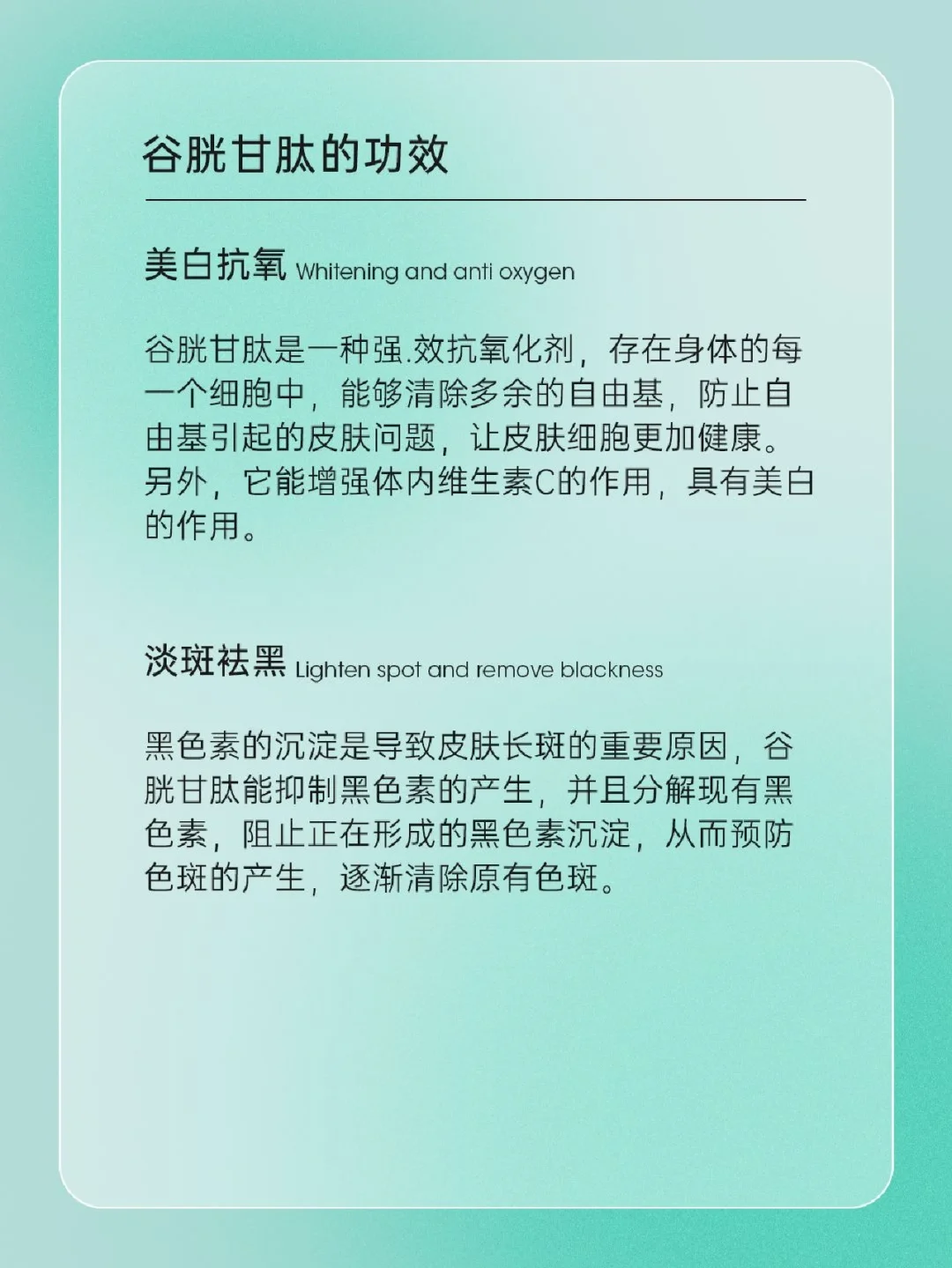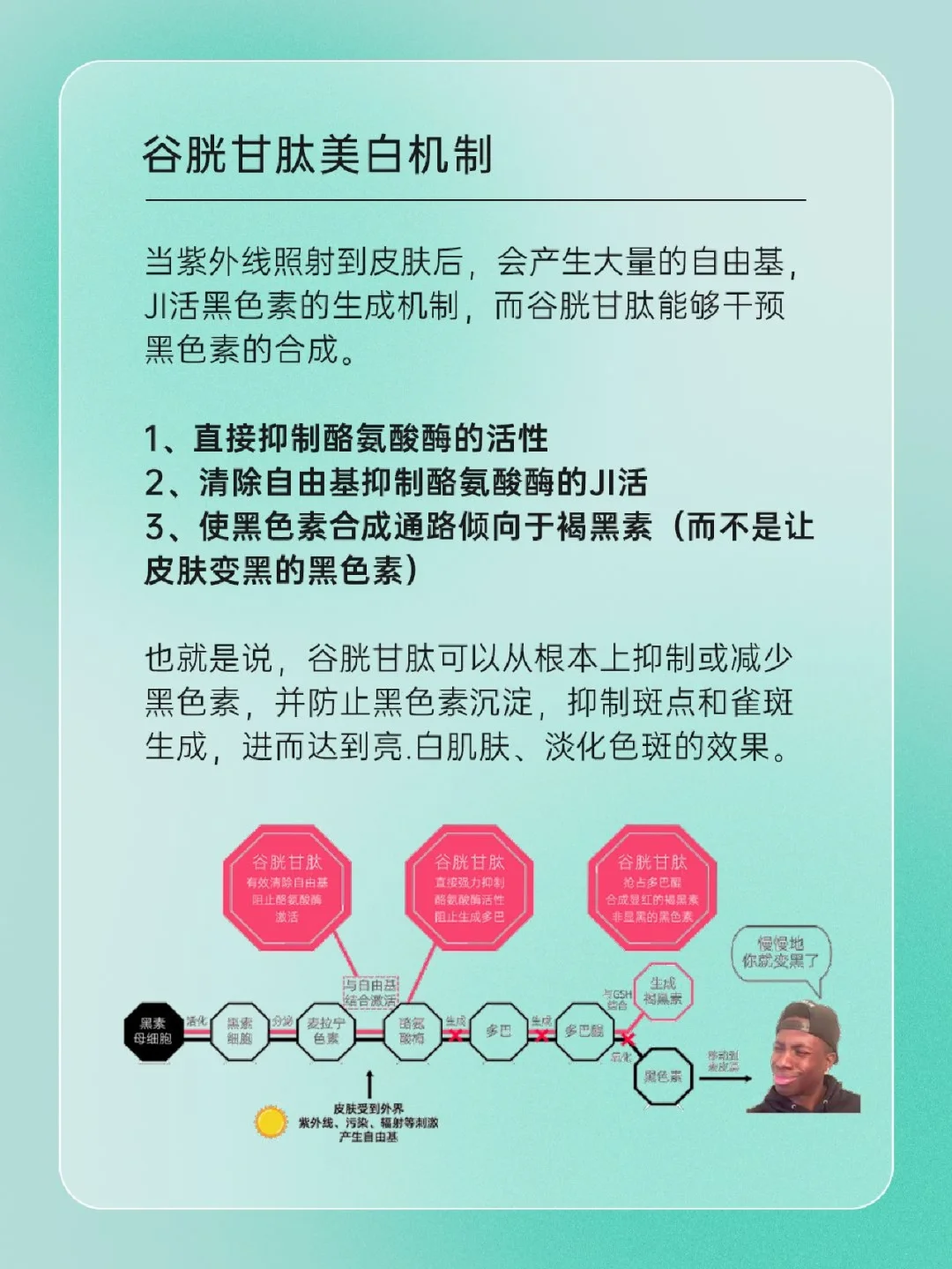 💚谷胱甘肽是什么? 💚谷胱甘肽的功效 · 美白抗氧 · 淡.斑袪黑 · 增强皮肤弹性 · 抗衰老 💚谷胱甘肽美白机制 1、直接抑制酪氨酸酶的活性 2、清除自由基抑制酪氨酸酶的ji活 3、使黑色素合成通路倾向于褐黑素(而不是让皮肤变黑的黑色素) 💚为什么要补充谷胱甘肽? 💚怎么补充谷胱甘肽? 一起来了解一下吧,下期还想看什么可❤️➕🍎告诉我哦