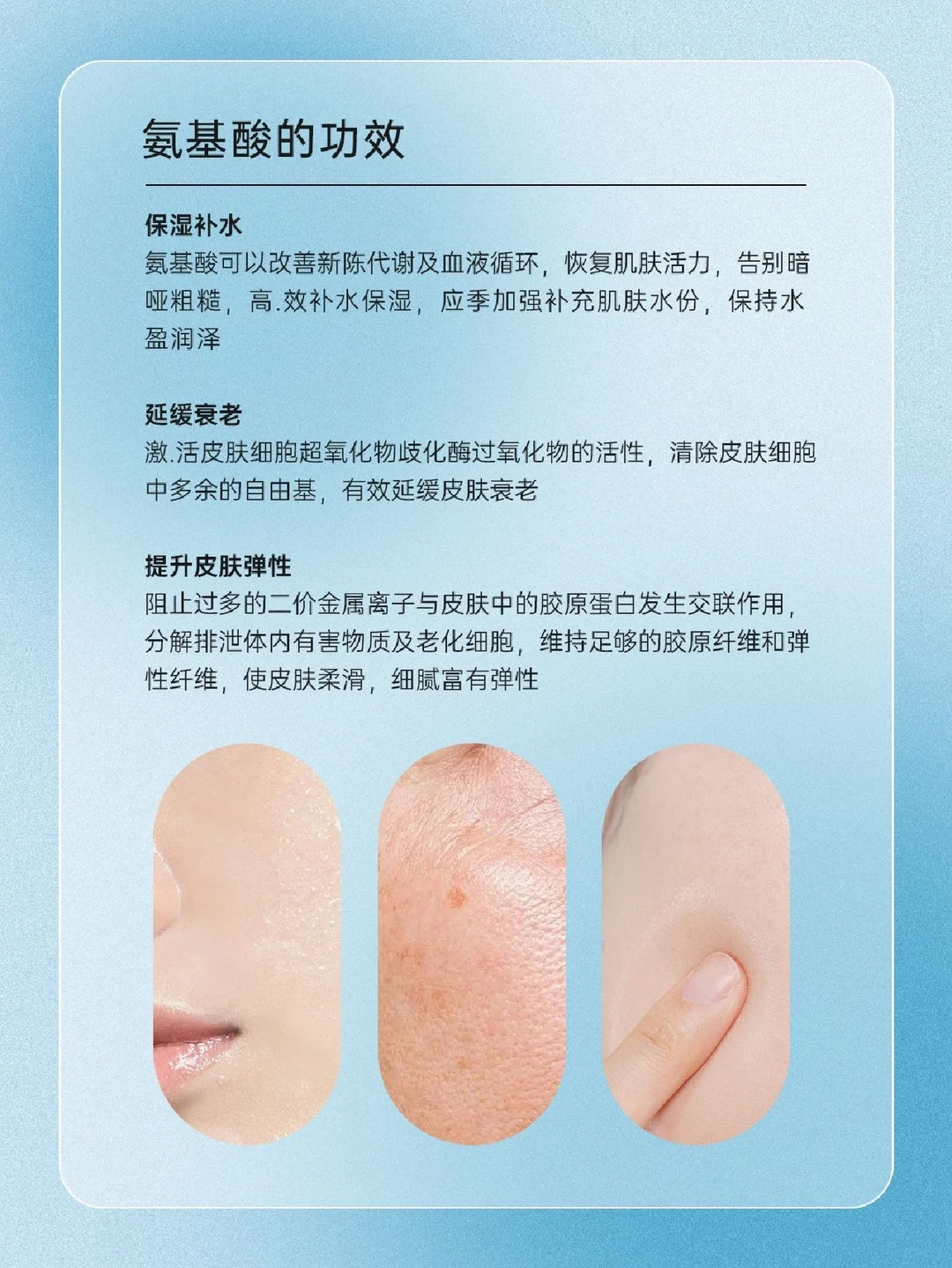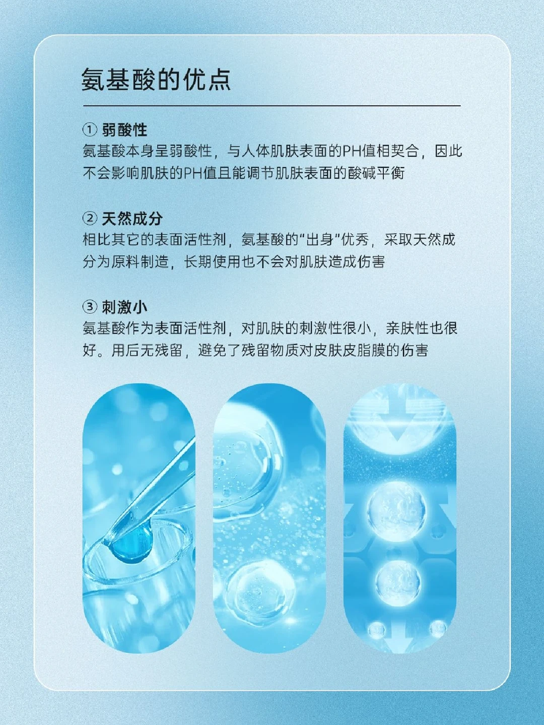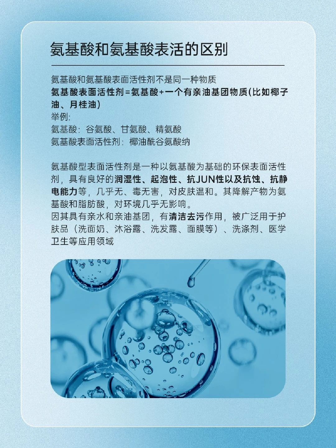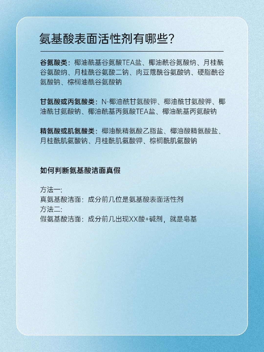 🐋氨基酸是什么 🐋氨基酸的优点 · 弱酸性 · 天然成分 · 刺激小 🐋氨基酸的功效 · 保湿补水 · 延缓衰老 · 提升皮肤弹性 🐋氨基酸和氨基酸表活的区别 🐋氨基酸表面活性剂有哪些? 🐋如何判断氨基酸洁面真假? 方法一: ⭕️真氨基酸洁面:成分前几位是氨基酸表面活性剂 方法二: ❌假氨基酸洁面:成分前几出现XX酸+碱剂,就是皂基
