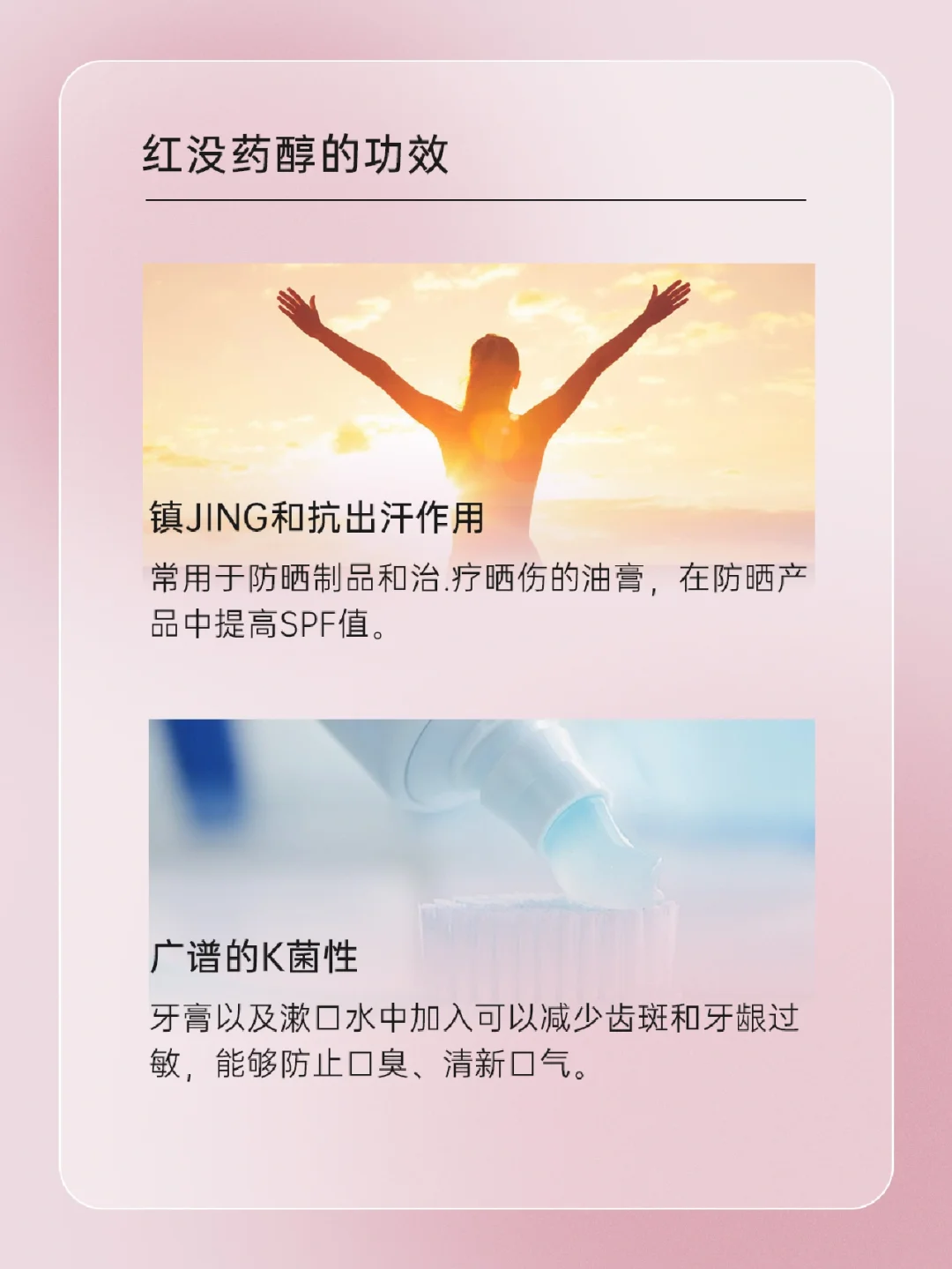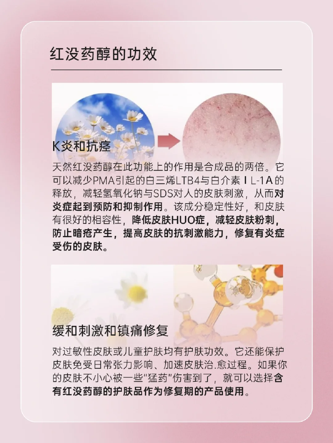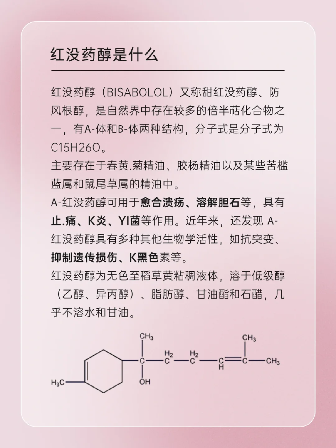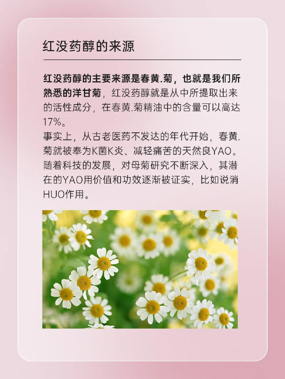 🌼红没药醇是什么 🌼红没药醇的来源 🌼红没药醇的功效 • K炎和抗痉 • 缓和刺激和镇痛修复 • 镇jing和抗出汗 • 广谱的K菌性 🌼红没药醇的优点 1. 香气清淡愉快 2. 皮层的高渗透性 3. 极好的稳定性 一起来了解一下吧,下期还想看什么可以❤➕🍎告诉我哦