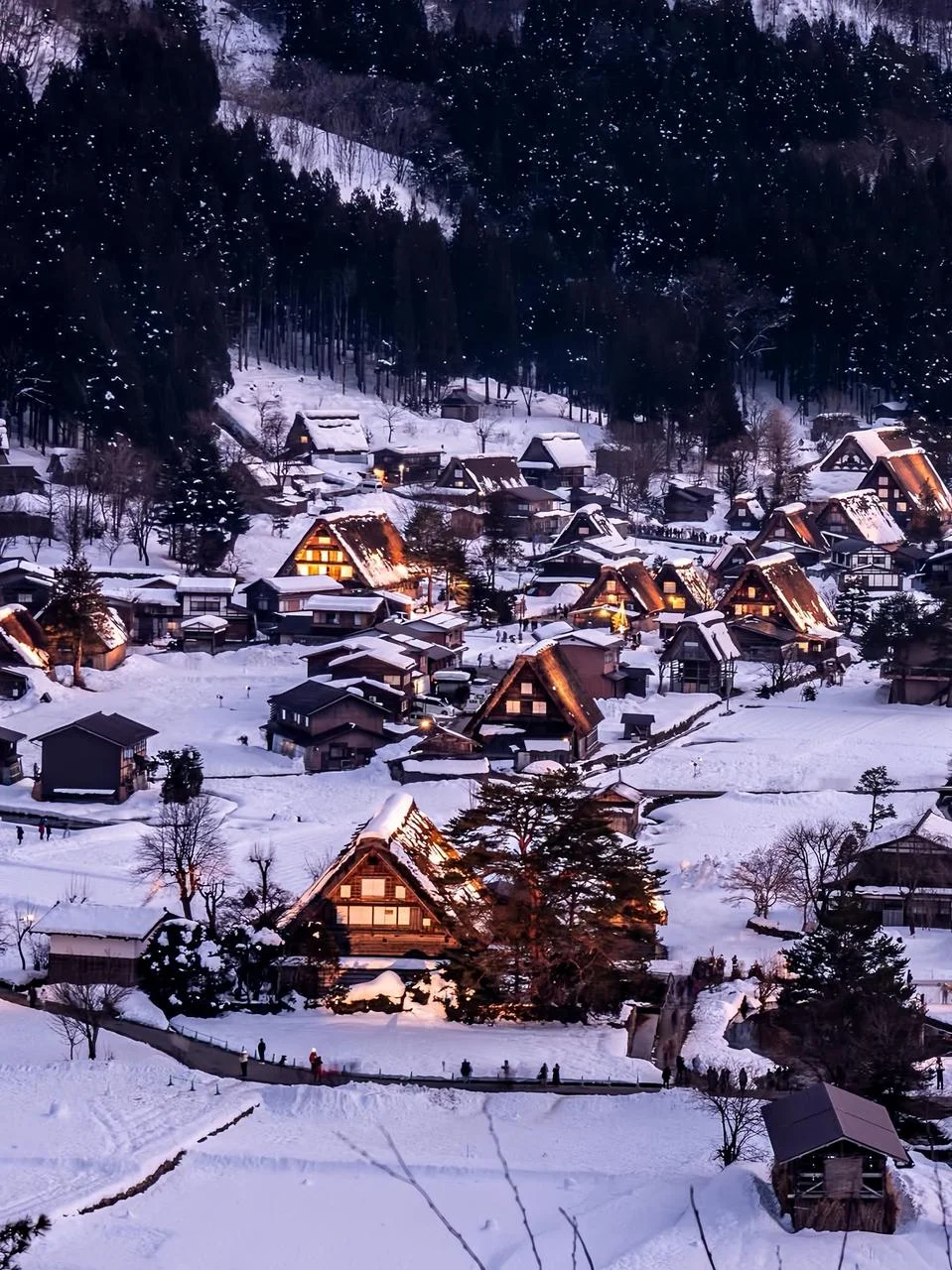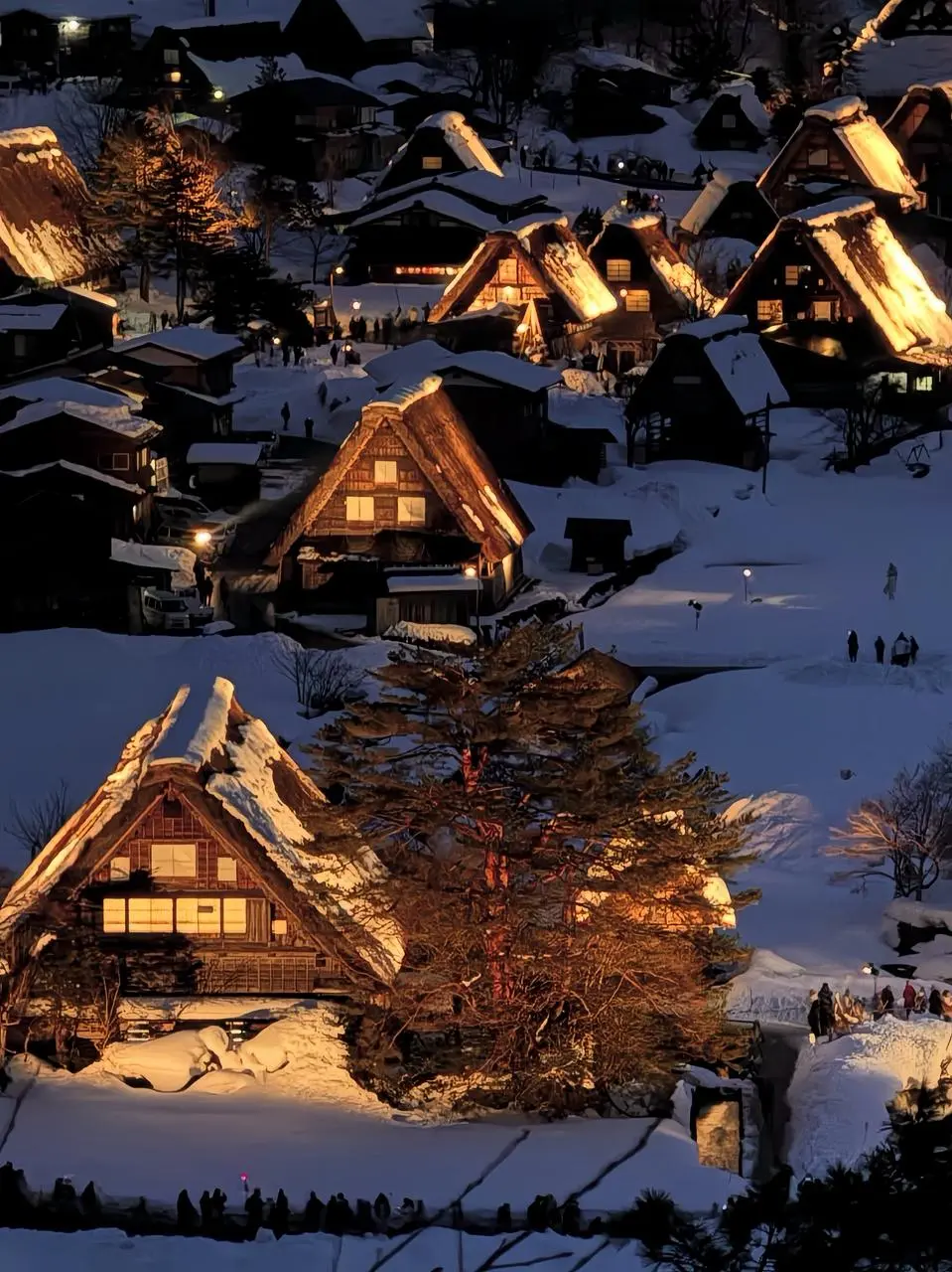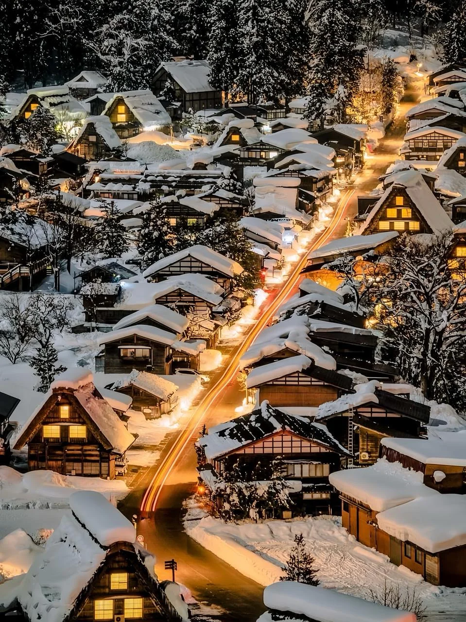 白川乡位于日本岐阜县,是以“合掌造”闻名的世界遗产村落。每年冬季限定举行的点灯活动,让整个雪村沐浴在金色灯光中,宛如走进童话国度 —— 是日式冬景中最具代表性的活动之一。