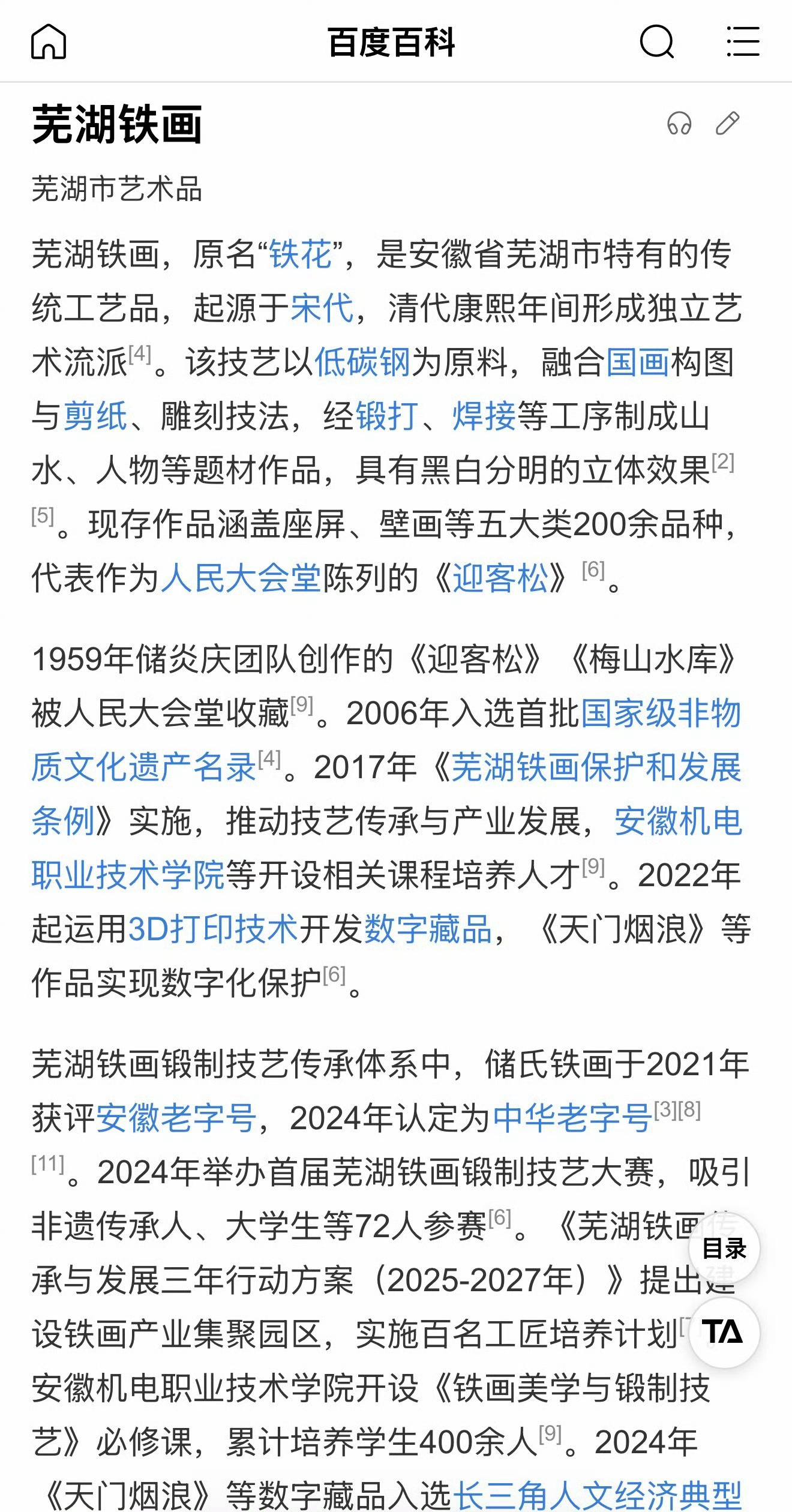 文化之旅悦非遗芜湖铁画是我们这儿的百年非遗,起源于宋朝以铁为料锻打焊接,融着国画的意境,每年春节我都会选它送朋友,把这份“锻铁为画”的巧思,当作带着温度的文化礼物。 发现非遗新物种