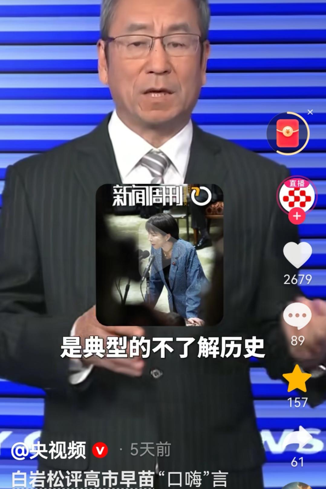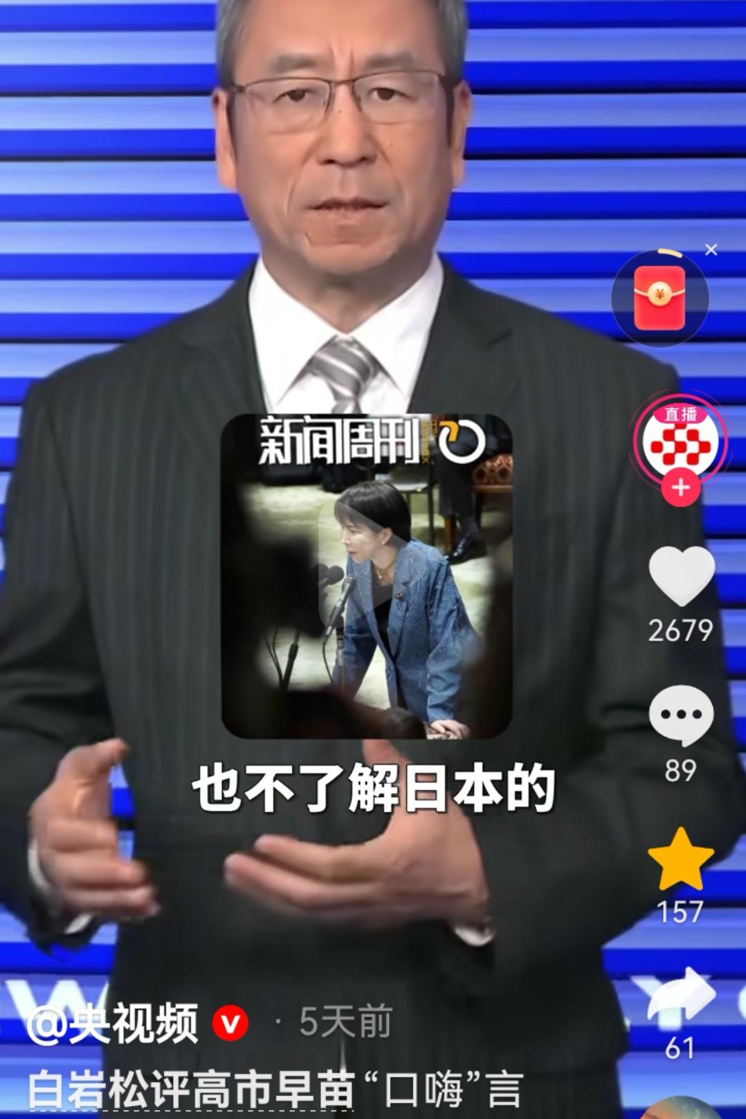 白岩松对高市早苗错误言论用“不了解”判断,你怎么理解! 高市早苗作为日本首相,背后的谋僚一大堆,光一个麻省太郎就是老谋深算、老奸巨猾的恨角色,高市早苗的观点代表的是日本政府,“不了解”的观点无从谈起,共情供成了煽情。 白岩松的不了解的观点,和官方对此次中日关系的观点有点对不上号。 白岩松可能太忙了,只关注自己的情感,还是记忆中的友好情结,没有时间看官方军方最近的新闻报道,事实是白岩松不了解事实真相,不了解历史,不了解祖国的立场和观点!高市早苗为何坚持其错误言论 日本对华态度为何傲慢