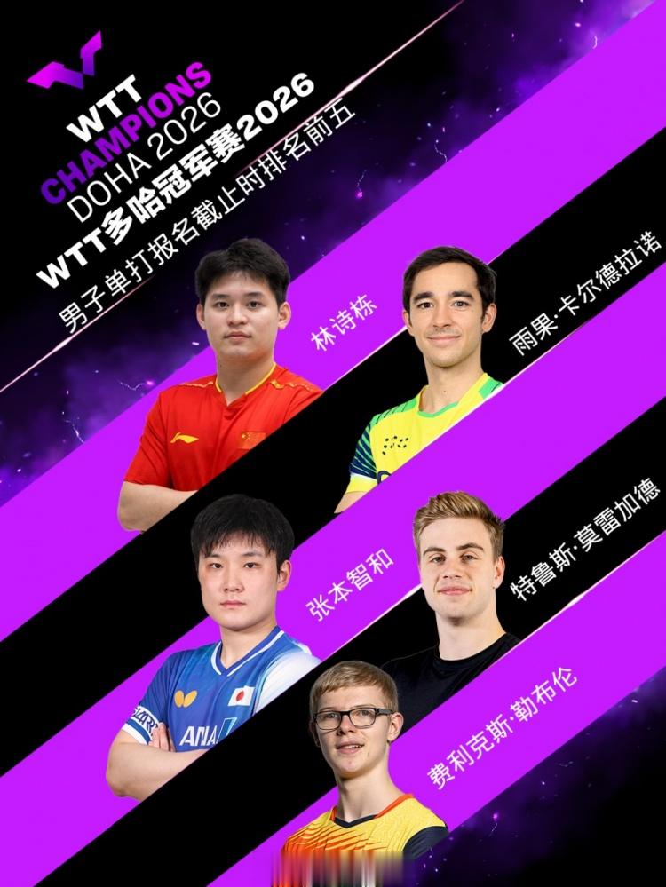 WTT多哈冠军赛2026将于1月7日至11日在卢赛尔体育馆举办,本站赛事冠军将获得1000点世界排名积分。报名截止时排名前五名单如下: