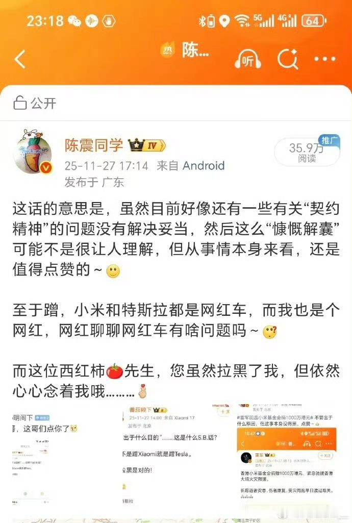 米粉反击,陈震破防!陈震终于被自己的回旋镖整破防了。你们还记得前两天小米为香