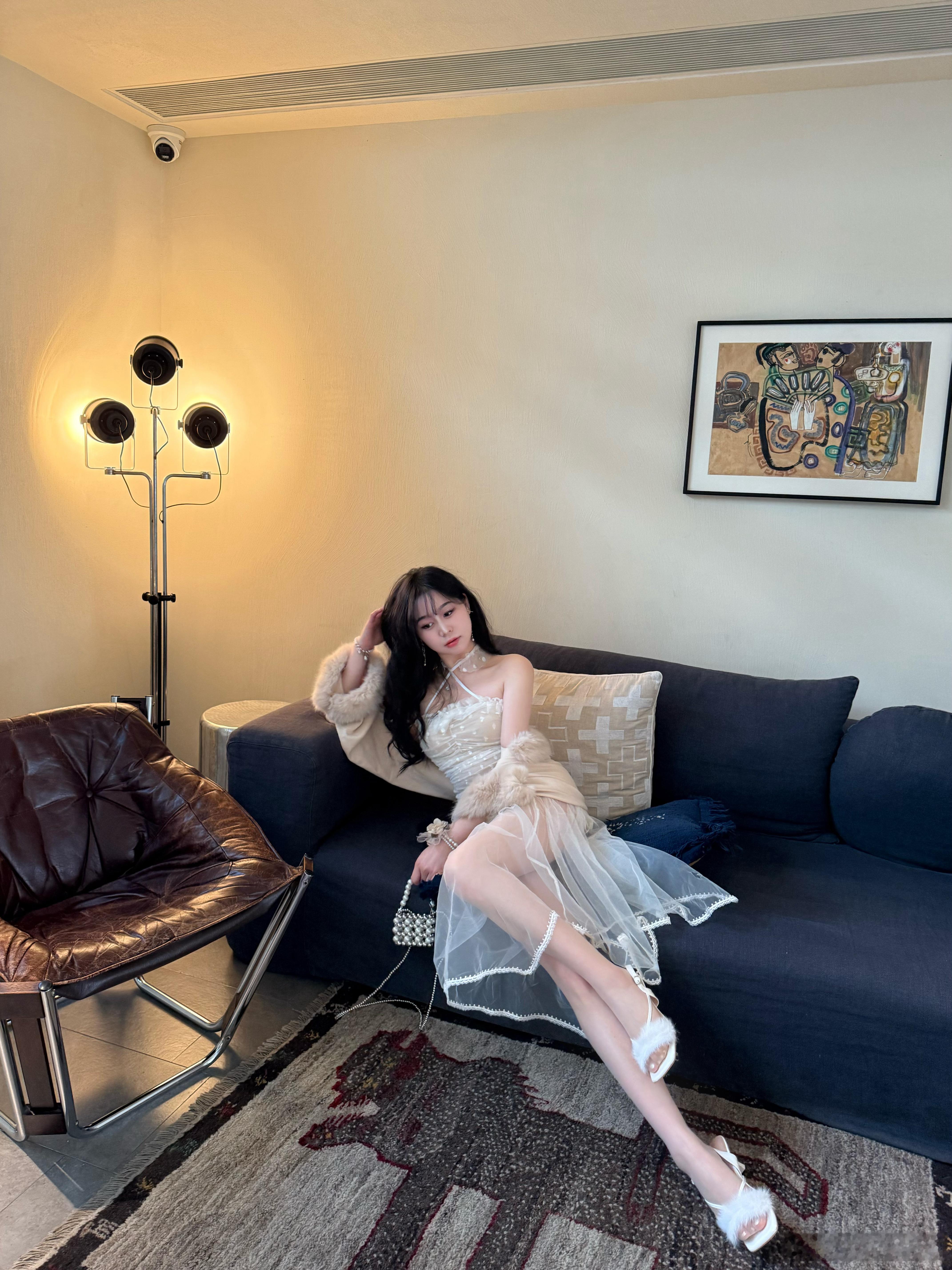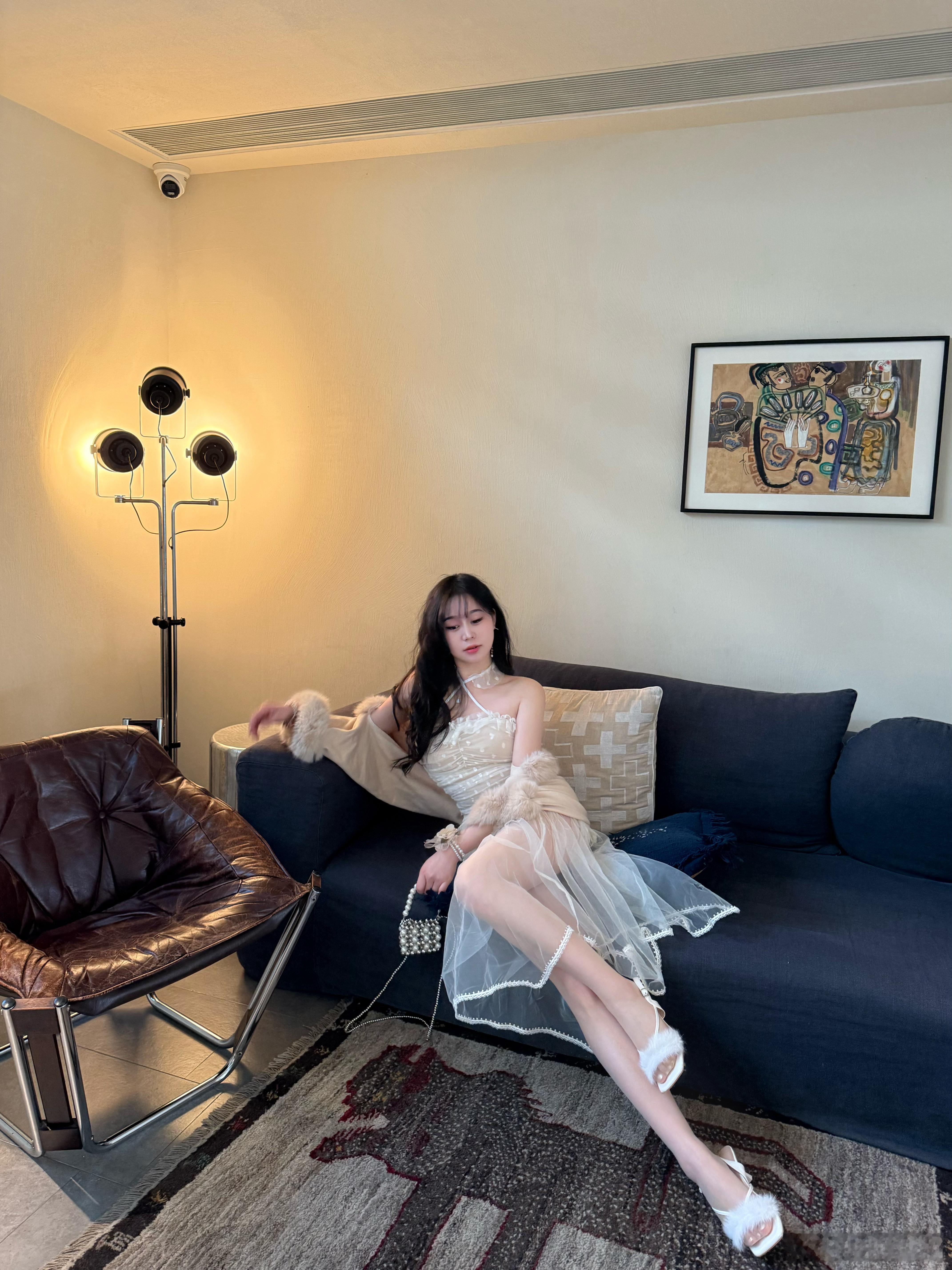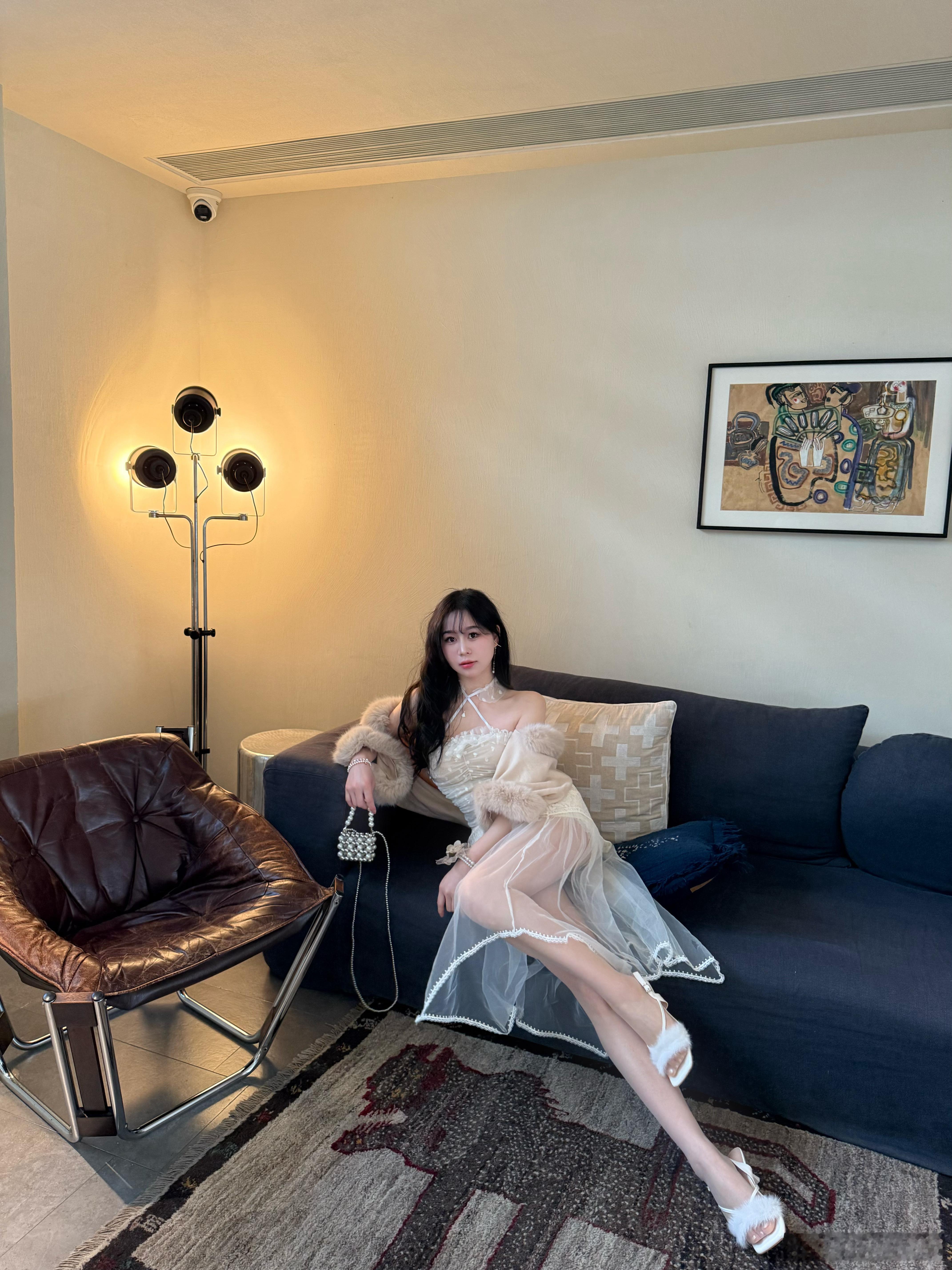 孙允珠身处一个简约而不失格调的环境。阳光透过轻柔的白色窗纱,洒落在木质地板上,一
