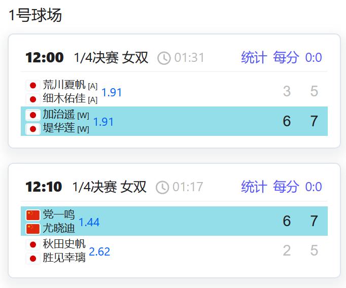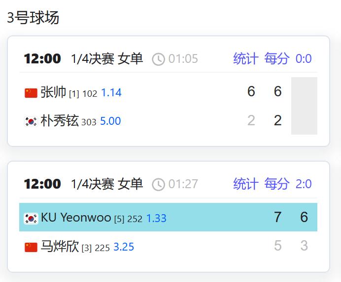 今日赛果: W75普莱福德,5号种子韦思佳5-7,3-6不敌4号种子英格丽斯,无缘女单四强;为了明年的澳网女单资格赛还需要继续努力赚分。 W50横滨,张帅6-2,6-2击败朴秀铉,晋级女单四强。凭借本场比赛的胜利,张帅的即时世界排名已经重返Top100,来到99位。 马烨欣5-7,3-6不敌韩国的具妍玗,无缘女单四强; 女双四分之一决赛,党一鸣/尤晓迪6-2,7-5战胜对手,晋级四强;稍事休息后,将与本土外卡组合加治遥/堤华莲争夺女双决赛席位。