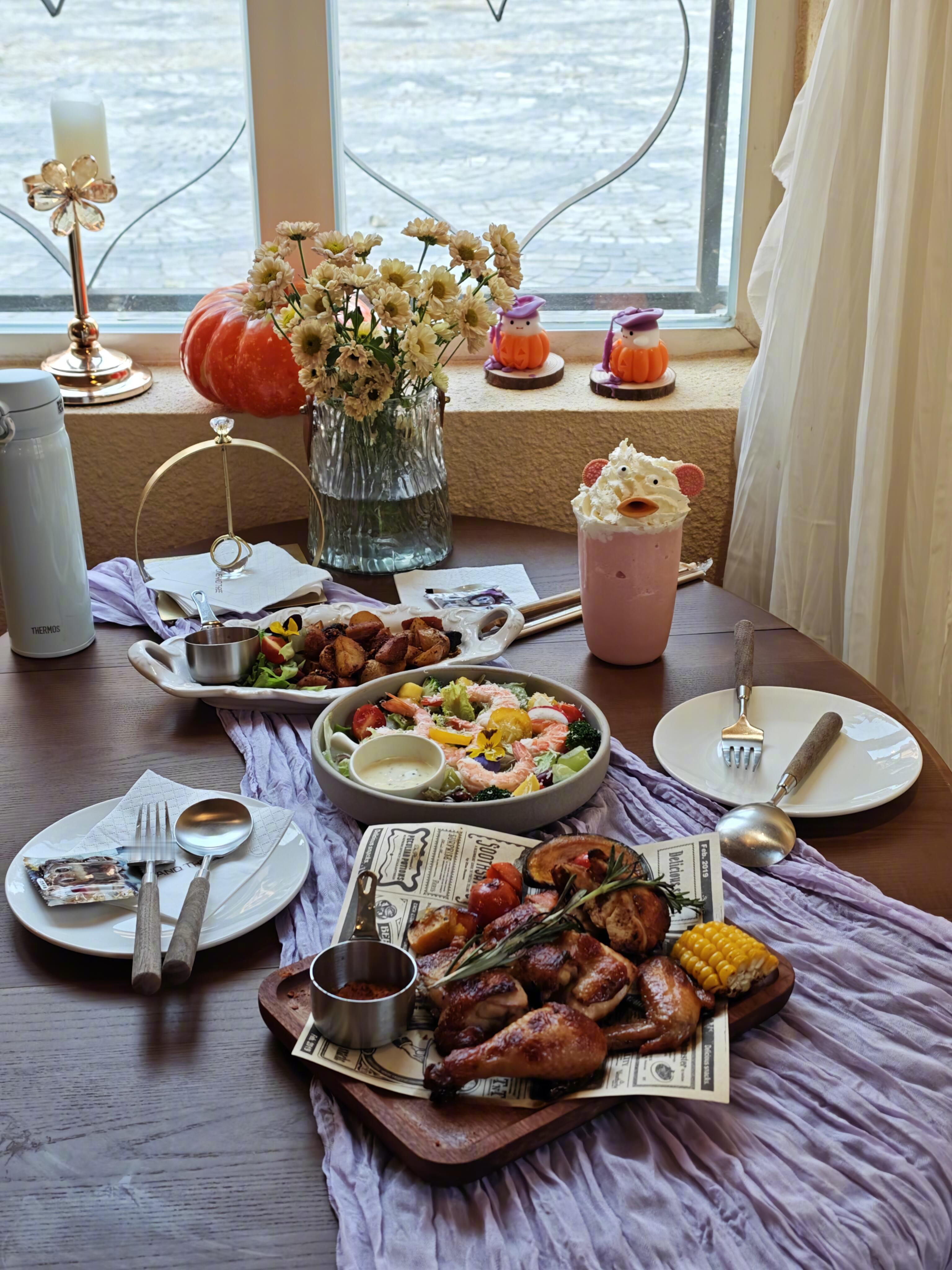 循着暖光推门,撞进满是生活气的温馨小馆。复古镜映着桌椅,南瓜摆件、黄小花与蕾丝桌布相衬,紫桌布上的烤物、沙拉鲜香漫开,窗边能望见街景。连空气都浸着治愈的软——原来烟火与诗意,能这般妥帖相拥